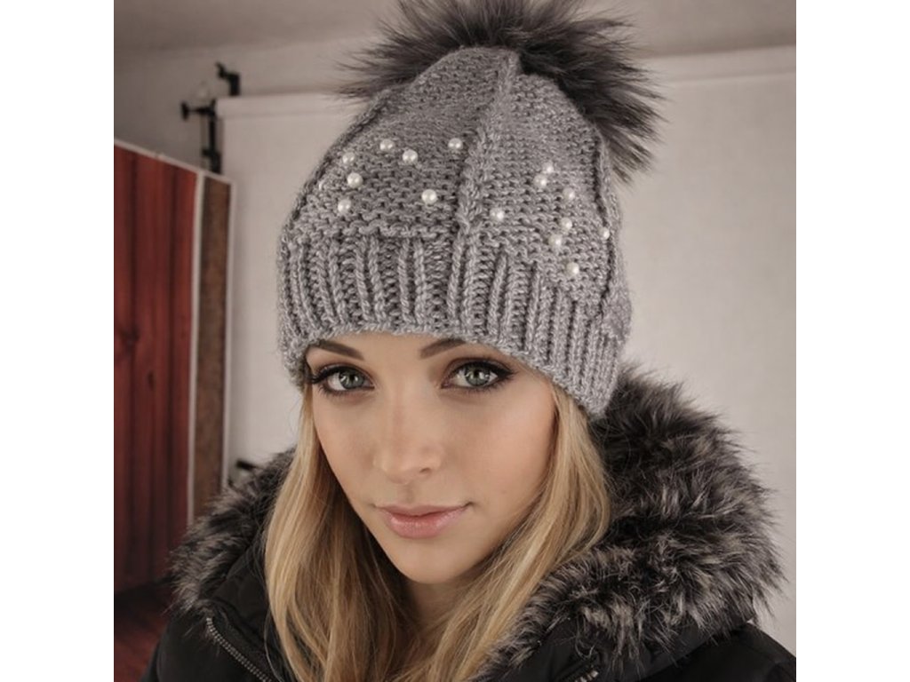 Šedá pletená čepice s decentním lurexovým vláknem a našitými bílými perličkami a velkou bambulí z pravé mývalí kožešiny, která je odnímatelná.