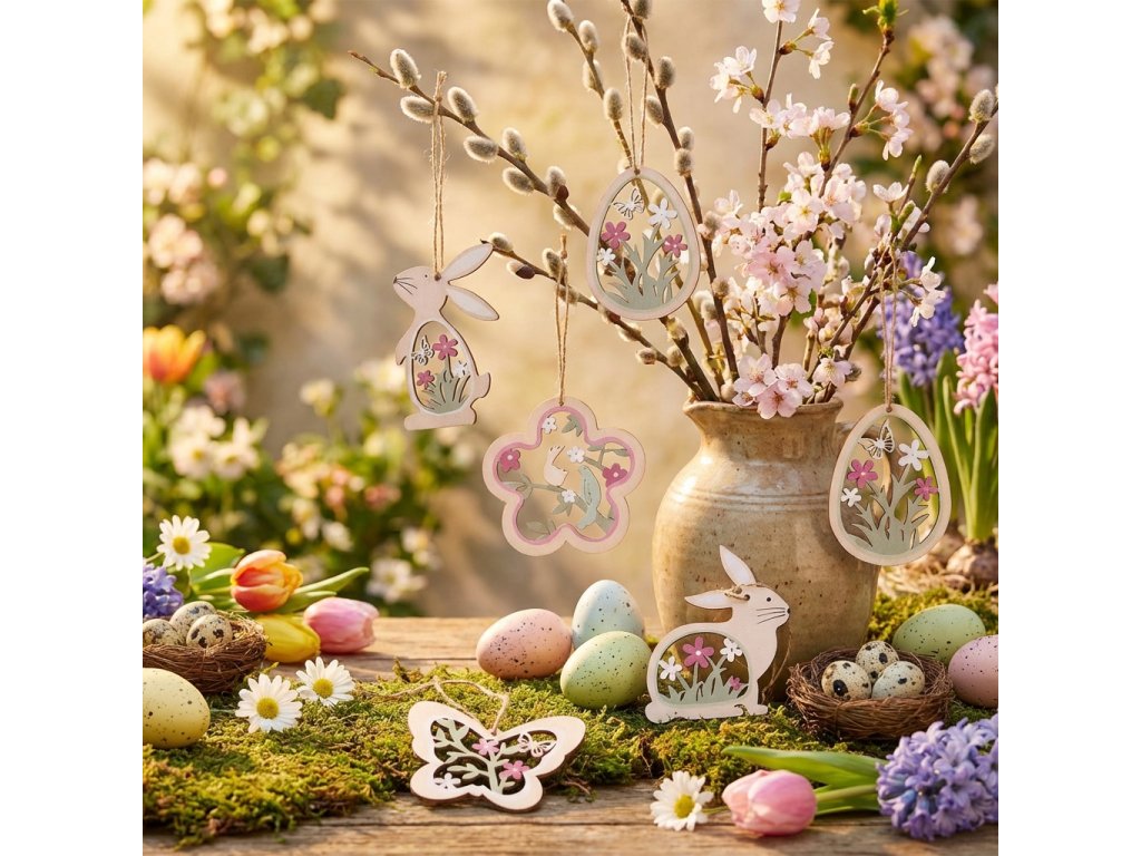 Vyzdobte si váš dům velikonočními dekoracemi. Dřevěné velikonoční dekorace, můžete zavěsit na jarní větvičky, na dveře, na okno nebo je použít k dozdobení vaší velikonoční výzdoby. Ideální dekorace na keře, stromy, větve, větvičky nebo živé ploty.