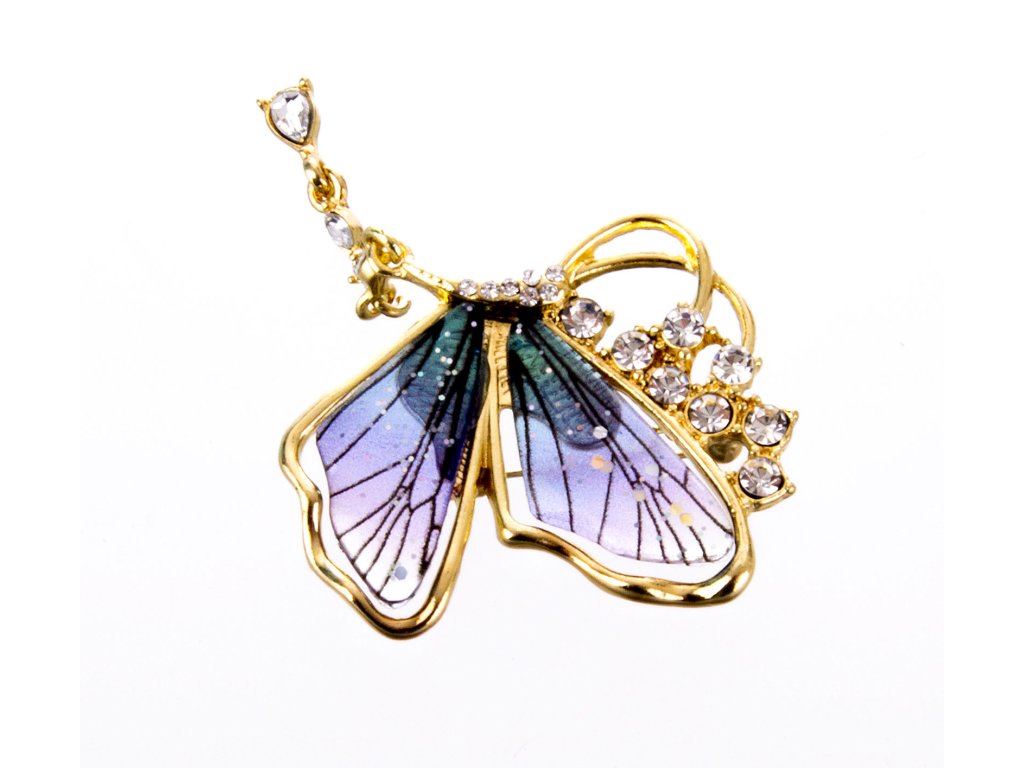 Brooch in the shape of a butterfly with rhinestones. The brooch has a safety pin on the back. Dimensions: 68x40mmAdditional parameters