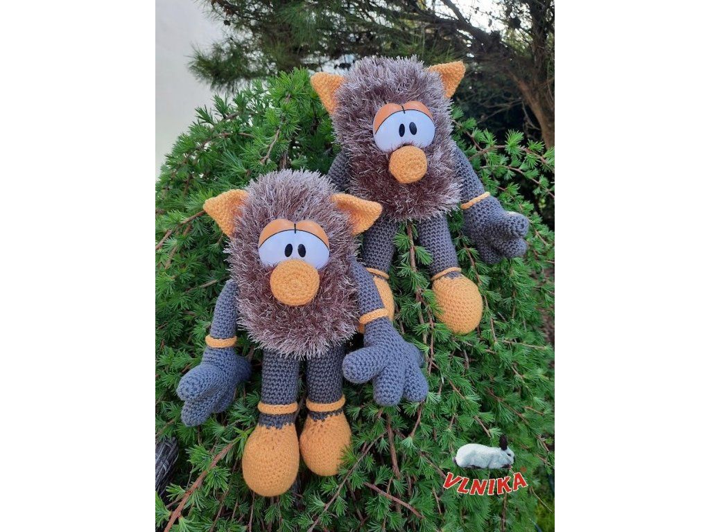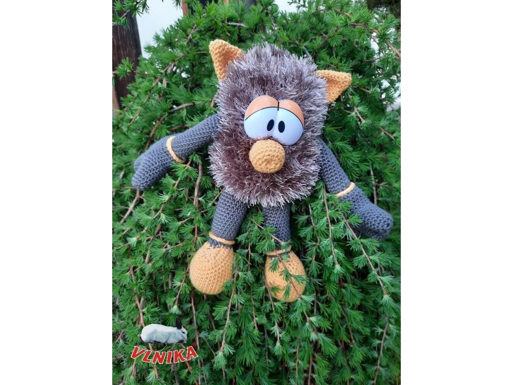 Original crocheted elf with a furry body and big eyes.