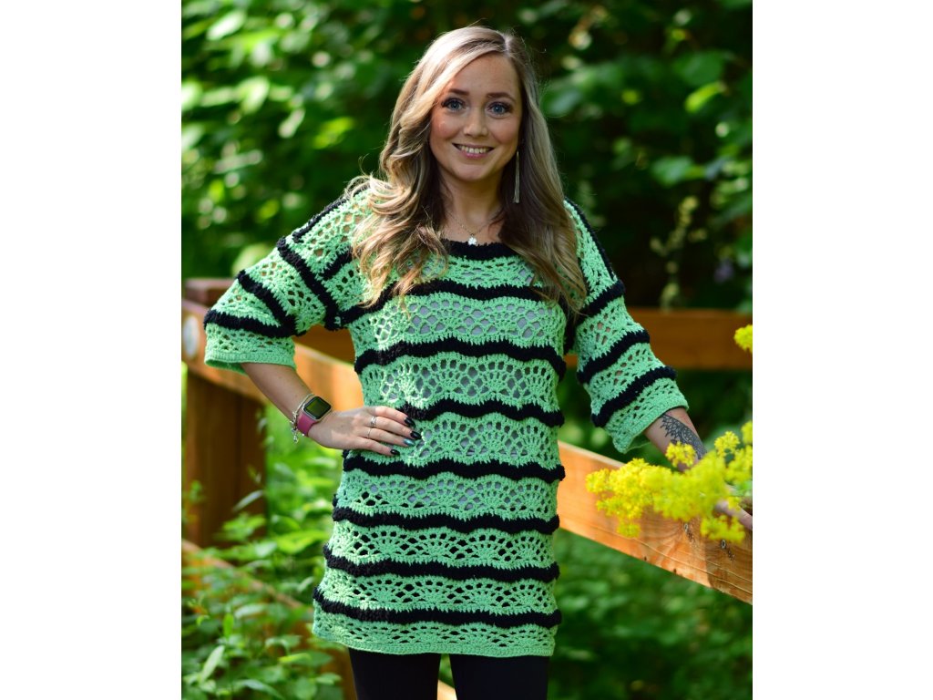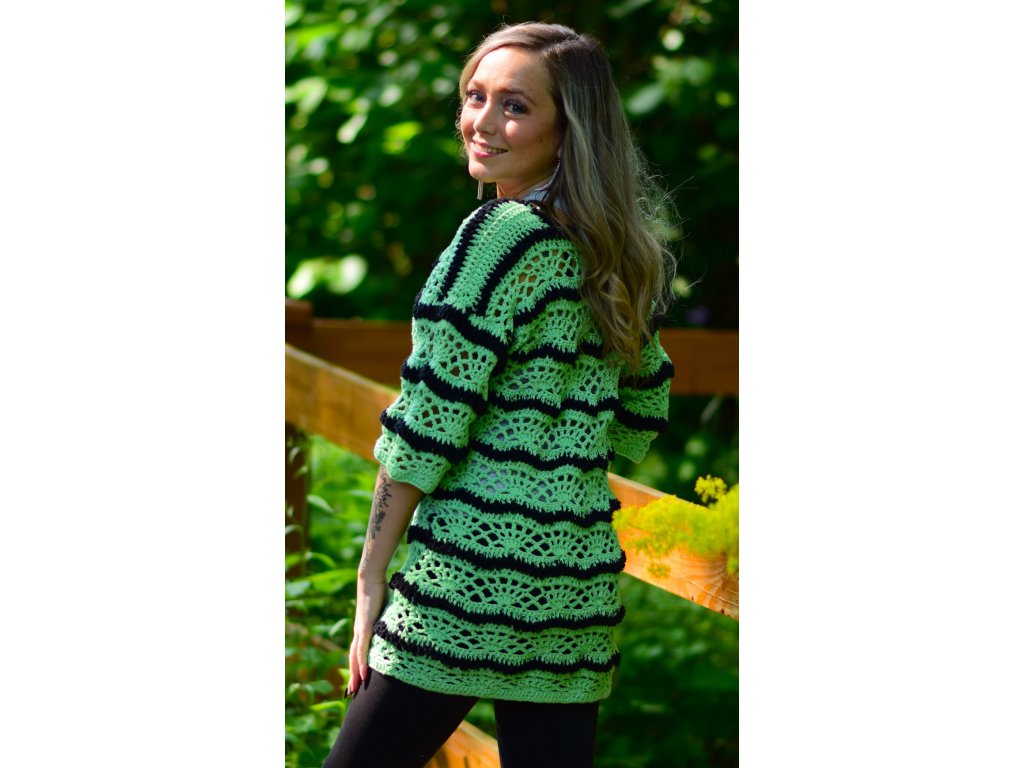 Háčkovaná zelenkavá delší tunika s černými kontrastními pruhy z žinylkové příze s tříčtvrtečními rukávy. Lze nosit samostatně, případně i na lehčí triko, rolák či košili.
