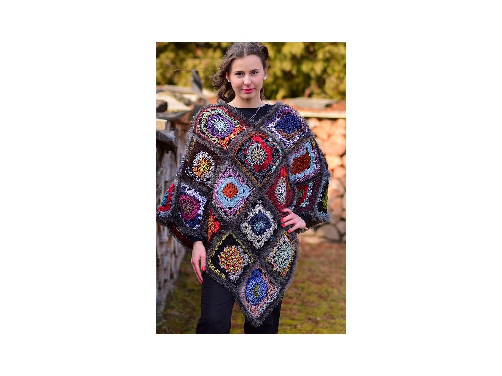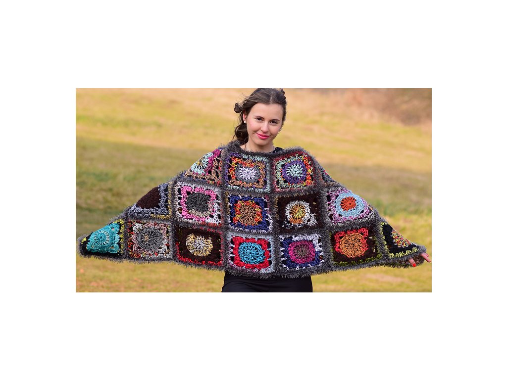 Vícebarevné pončo z háčkovaných čtverců, lemované střapatou přízí.