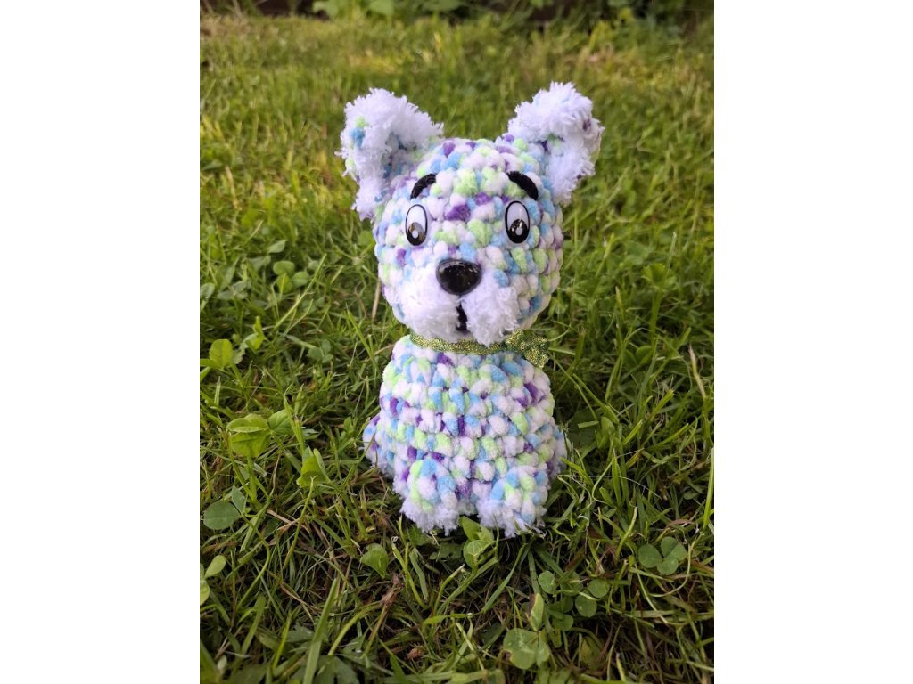 Háčkovaný barevný pejsek z žinylkové příze s chlupatými oušky a tlapkami.