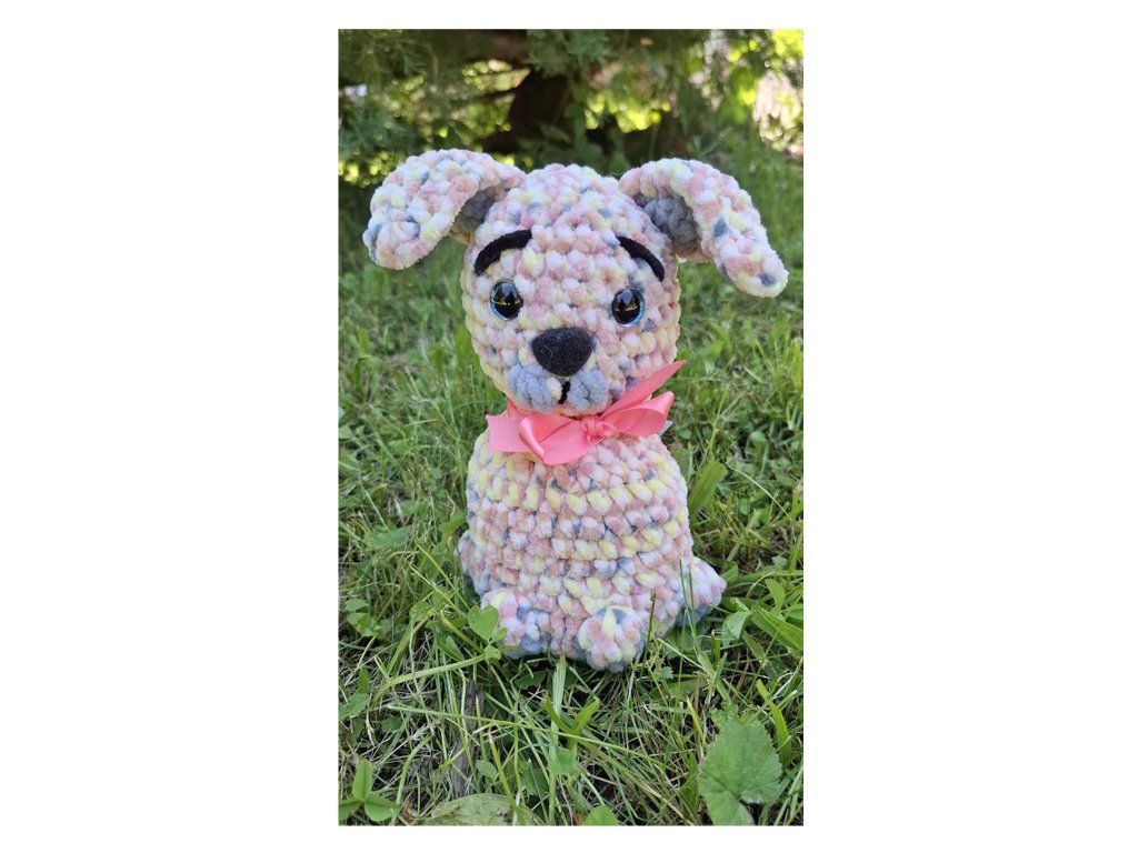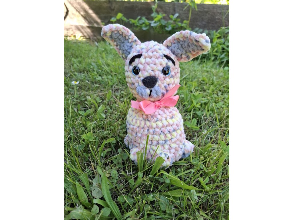 Háčkovaný pejsek s dlouhýma ušima ve světle melírovaném odstínu.
