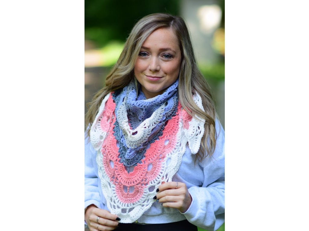 Háčkovaný šátek v jemných barevných tónech s proužkem z efektní lurexové příze.