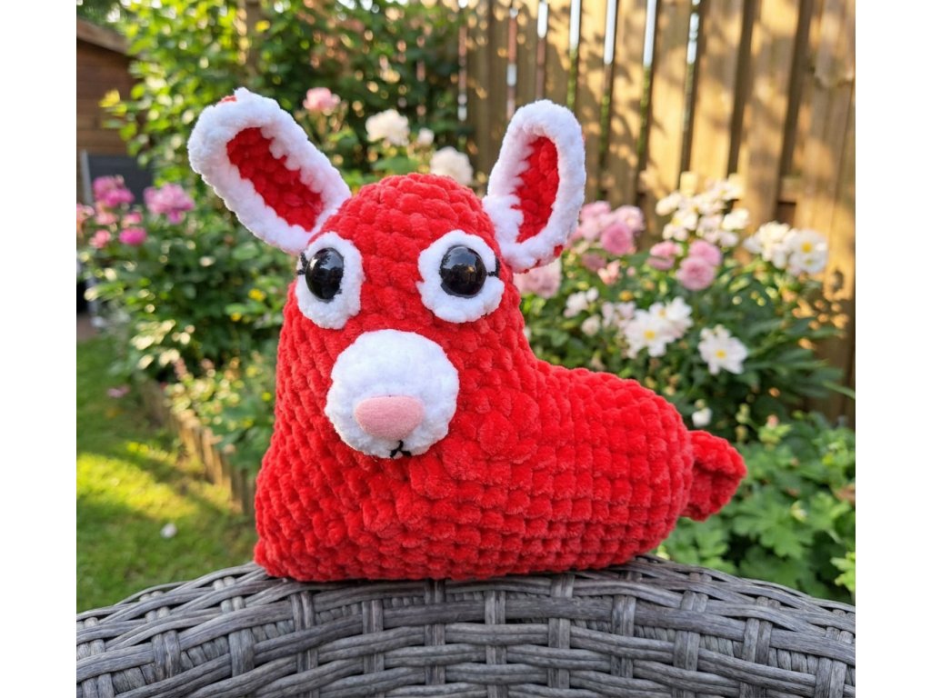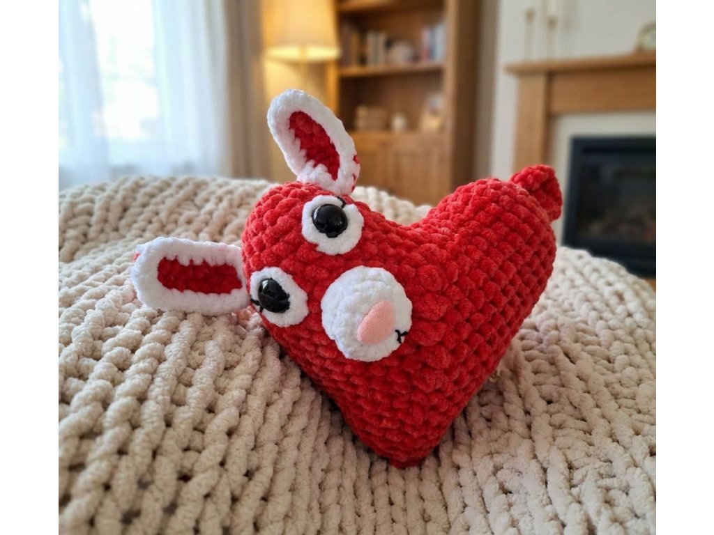 A cute crocheted bunny in bright red, which with its unique heart shape will bring a smile to the face of every recipient. This handmade pet measuring 21x21 cm is an ideal gift for Valentine's Day, birthdays or just for fun. The bunny is made of high-quality velvety soft yarn Samet Soft with polyester fiber, which makes it pleasant to the touch and holds its shape perfectly. The safety plastic eyes are firmly attached, so there is no risk of them falling off or being easily removed intentionally. Give a piece of love and tenderness in the form of this charming hand-crocheted bunny!