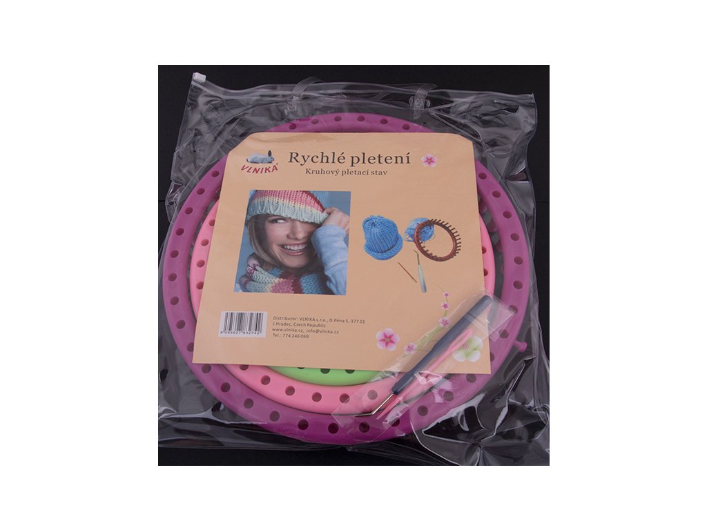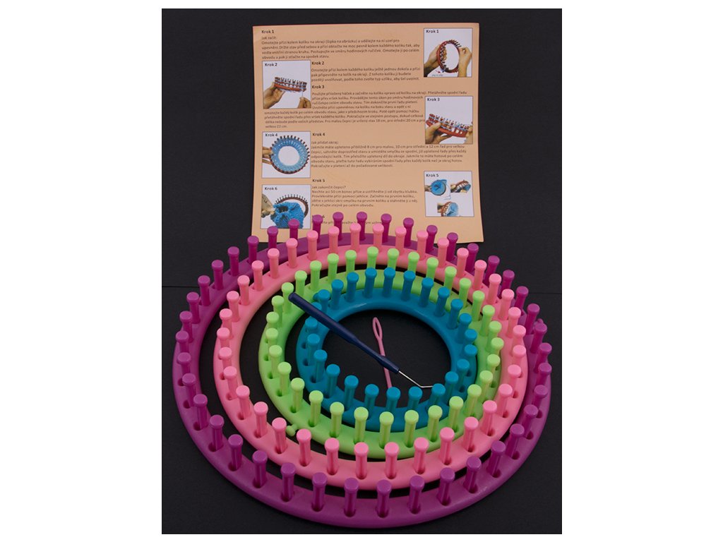 Knitting loom for the production of hats. In one package there are 4 knitting looms in a diameter of 13 cm, 18 cm, 23 cm, 28 cm and instructions for creating a hat using a knitting loom.Additional parameters