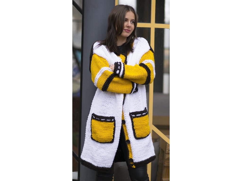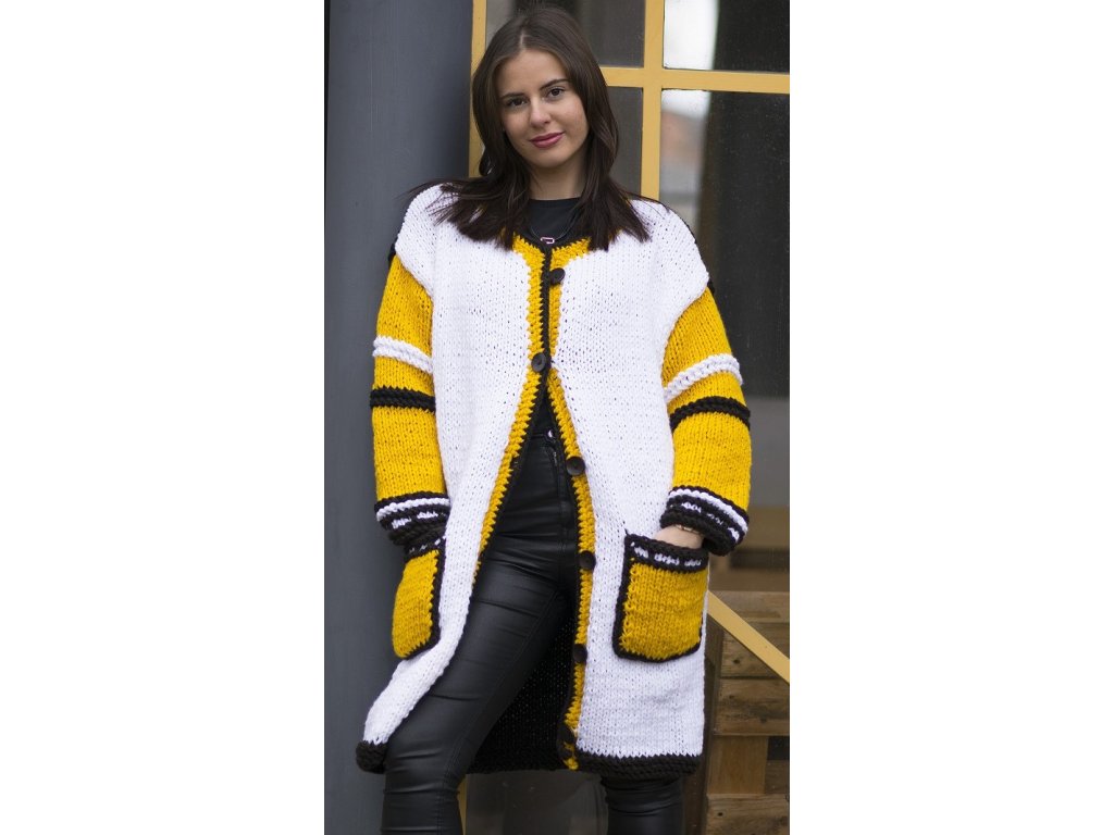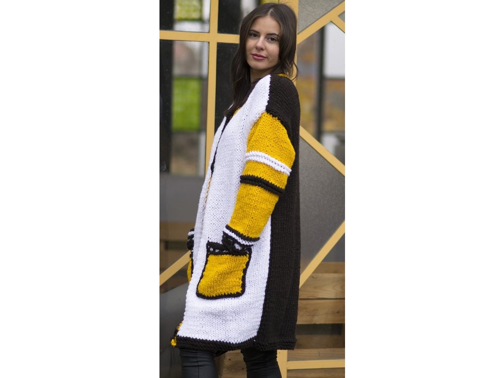 Pletený silný kabát s kapsami v kombinaci zemitých barev. Využití najde zejména na jaře a na podzim.