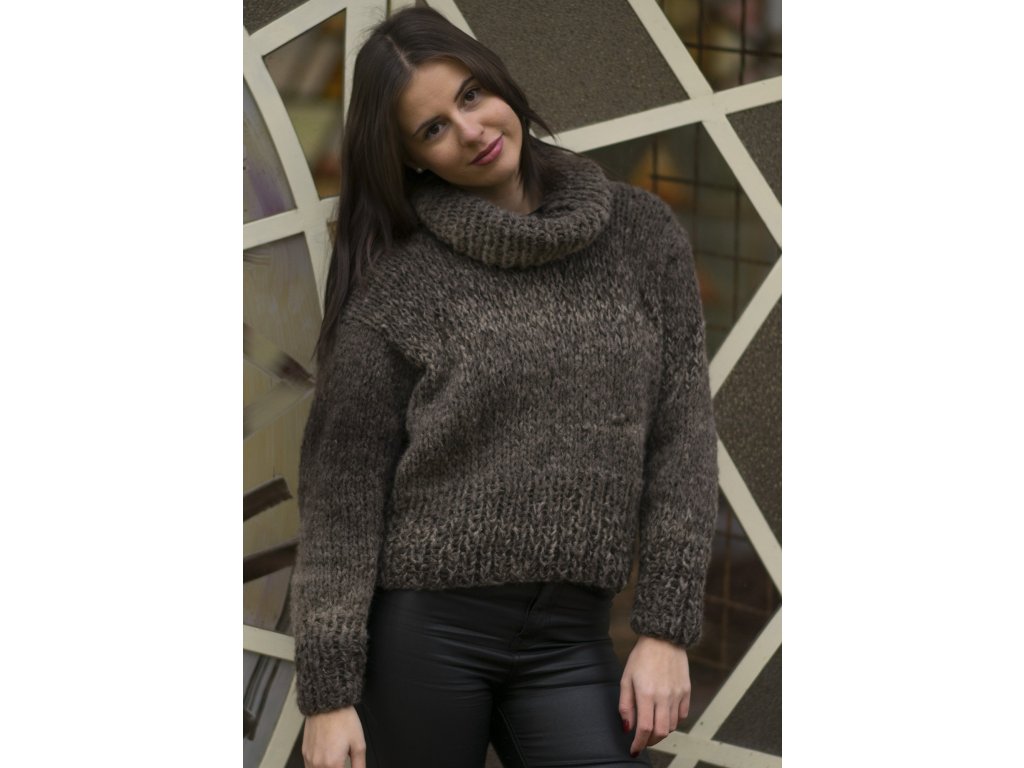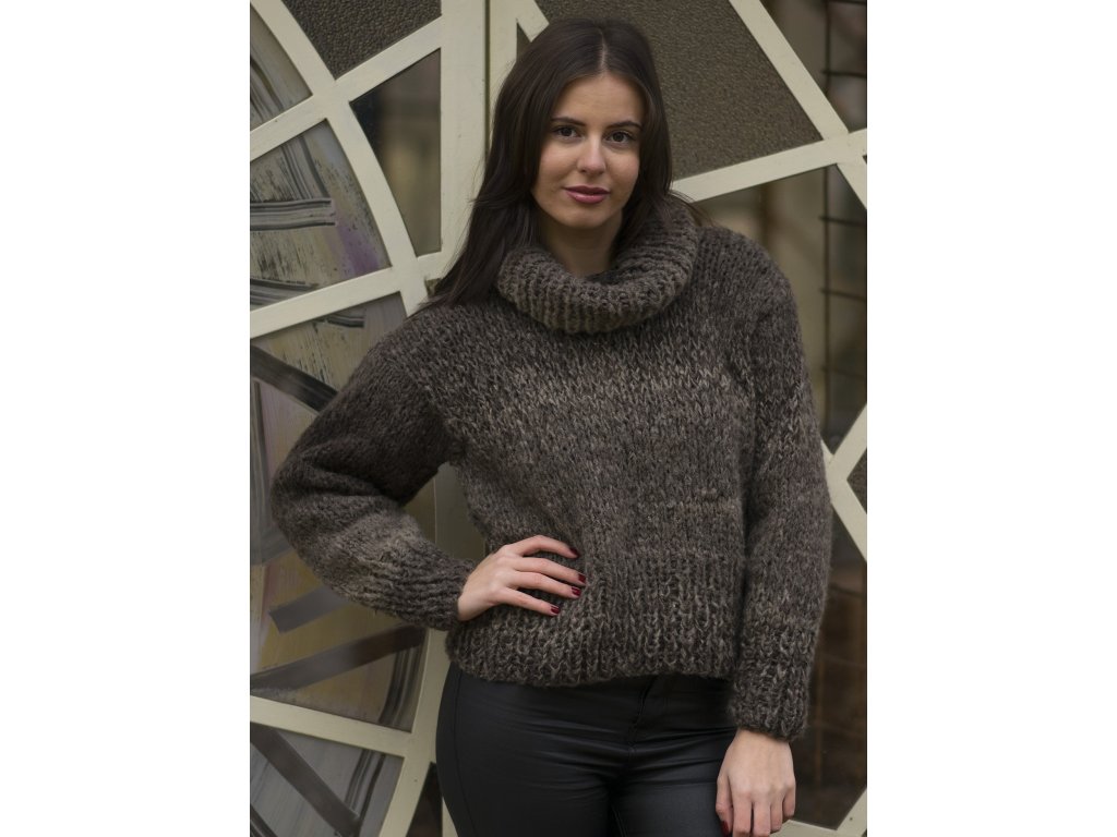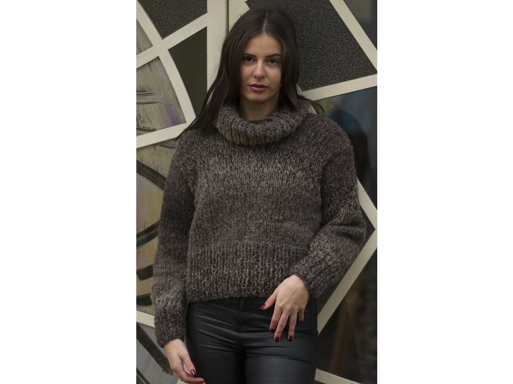 Ručně pletený svetr s rolákovým límcem z nadýchané příze v hnědošedém odstínů.