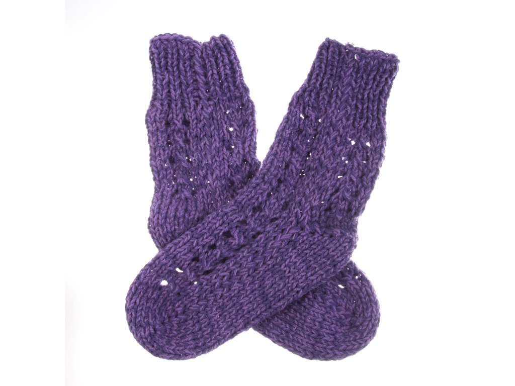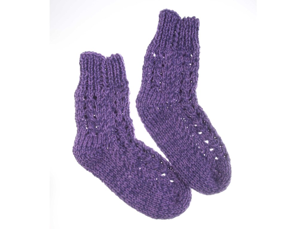 Ponožky jsou pletené z akrylové a bavlněné příze. Vypletený dírkatý vzor. Barva fialová.