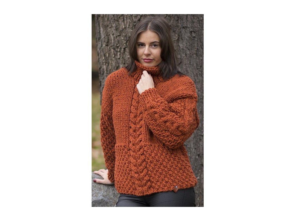 Ručně pletený silný svetr se stojacím límcem, který určitě zahřeje. Spodní část je pletena hráškovým vzorem stejně, jako rukávy. Na předním díle je vypletený copánkový vzor.