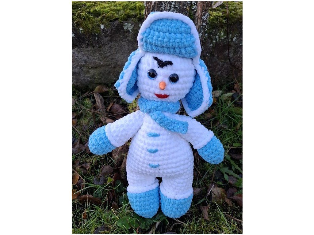 Crocheted snowman made of soft white chenille yarn with blue accessories.