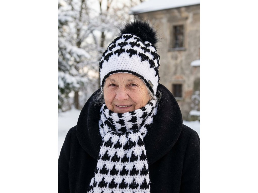 Černo-bílá čepice s velkou černou bambulí, je ideální pro všechny paní i slečny a ladí takřka s každým oblečením.