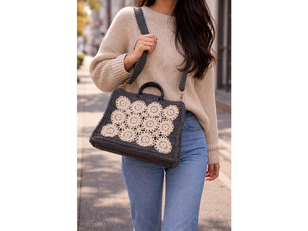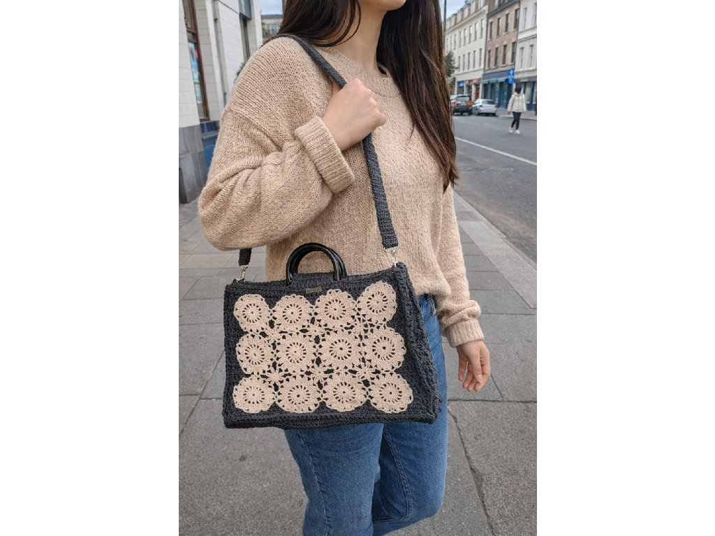 Tmavě šedá objemná kabelka s béžovými jemnými aplikacemi na přední části. Plastová černá ucha a delší popruh přes rameno.