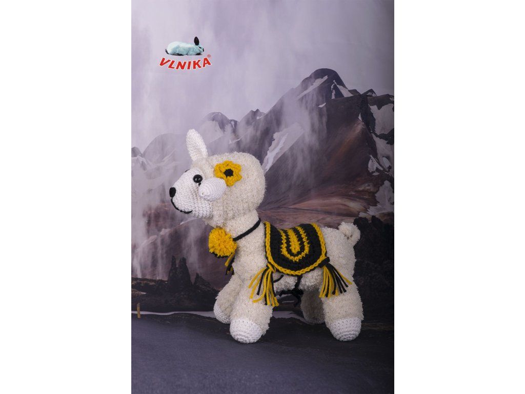 Naše lama je háčkovaná z přízí v krémovém odstínu. Má barevné sedlo a ozdobné bambulky na krku.