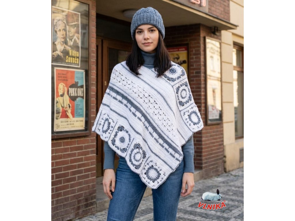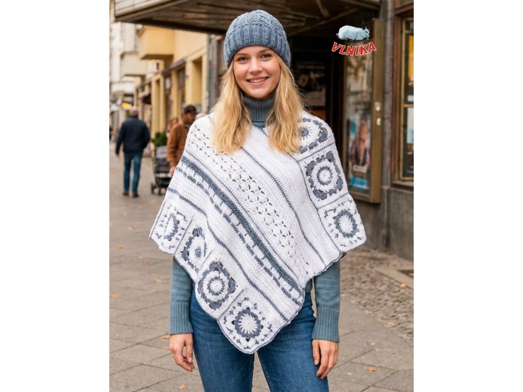 Bílé pončo s efektními dekory z lesklé modro-šedé příze s lurexovým třpytem.