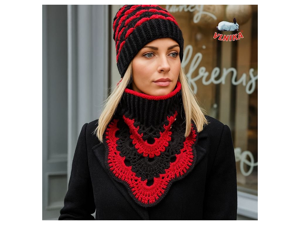 Červeno-černý háčkovaný límec, který lze jednoduše přetáhnout přes hlavu, přitom měkce přiléhá ke krku.