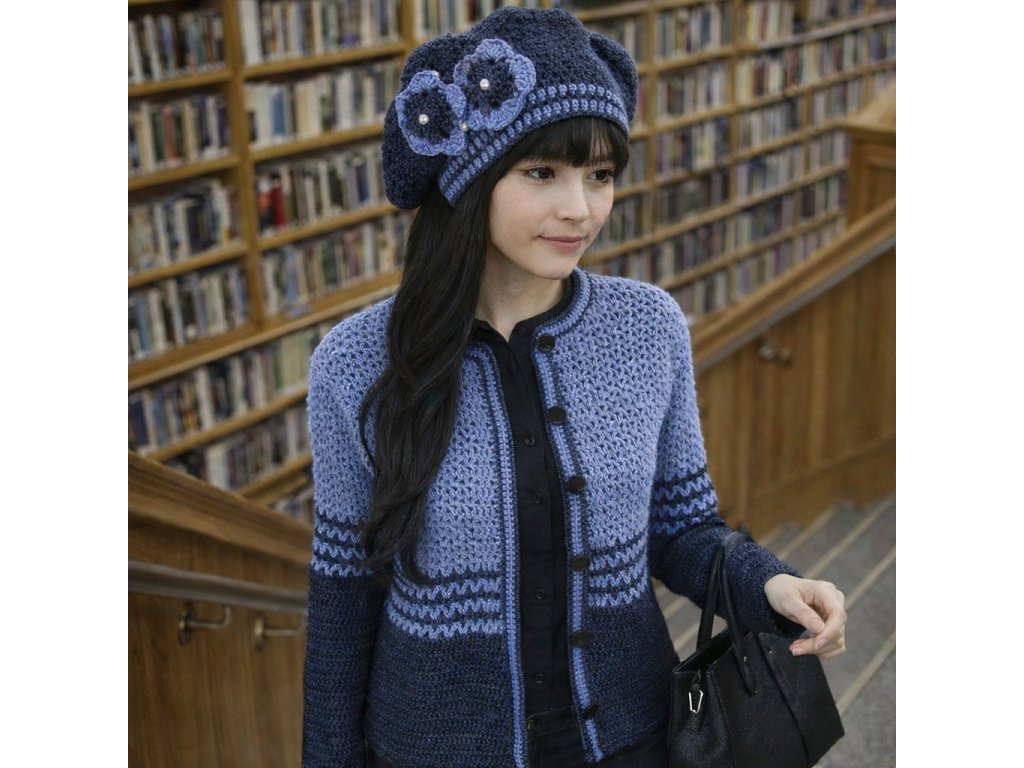 Háčkovaný zapínací svetr v decentních modrých odstínech . Lehce vypasovaný se zapínáním na tmavě modré knoflíky.