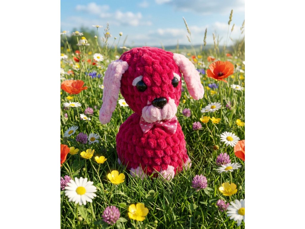 Háčkovaný pejsek s dlouhýma ušima a růžovou mašlí.