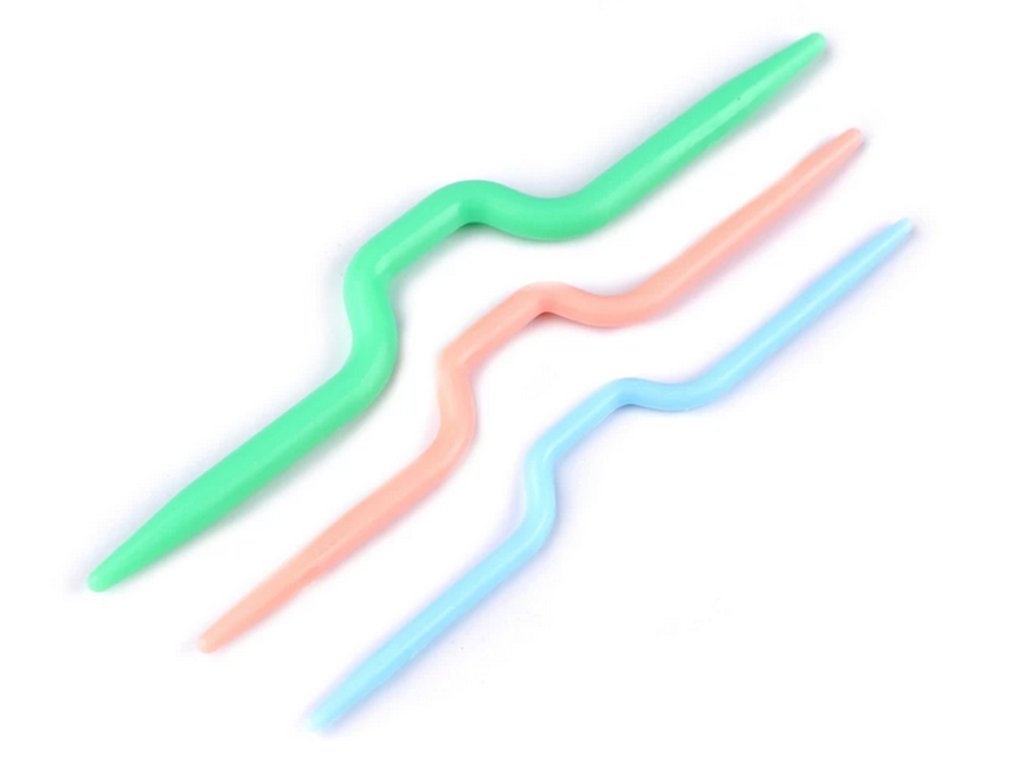 Pomocné prohnuté jehlice využijete pro pletení copánkového vzoru. Jsou vyrobené z plastu, velmi lehké a příjemné do ruky. V balení najdete tři průměry - 3 mm, 4 mm, 5 mm. Délka: 9; 9,6; 10,6 cmDoplňkové parametry