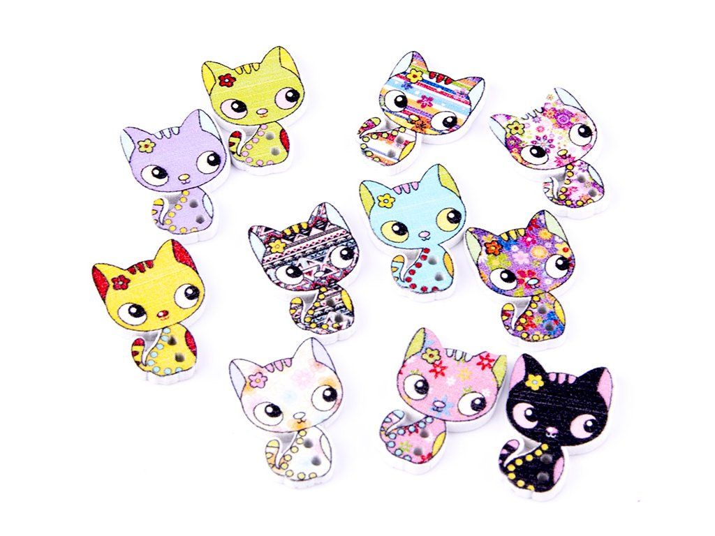 Prodej náhodný mix. Po 1 ks. Dřevěný knoflík o velikosti 25x16 mm. Tento dekorační ozdobný knoflík ve tvaru kočky je vhodný jako ozdoba na oblečení, háčkované a pletené věci - čepice,šály,ponožky, pondkolenky a jako dekorace na taštičky, kabelky.