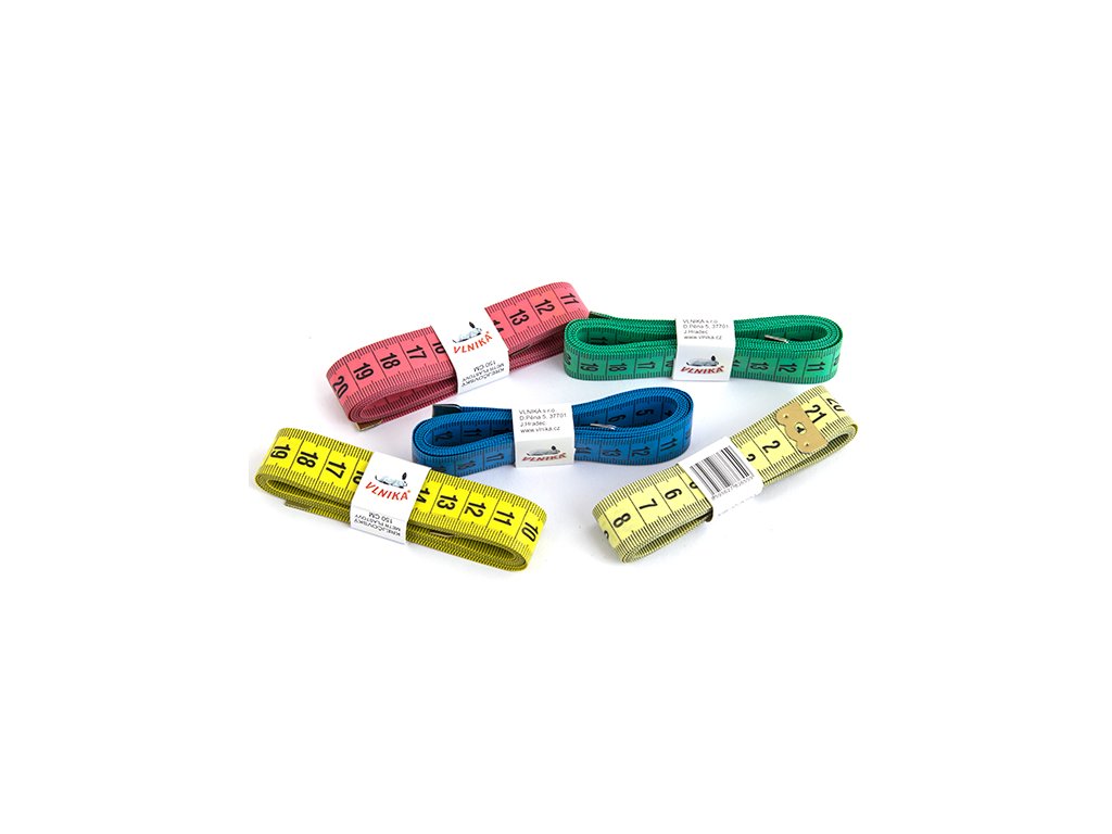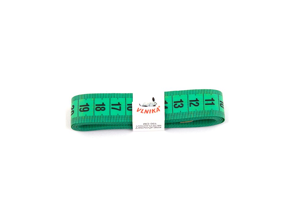 Krejčovský metr s mosaznou koncovkou, délka 150 cm. Metr má po obou stranách uvedeny jednotky v cm.