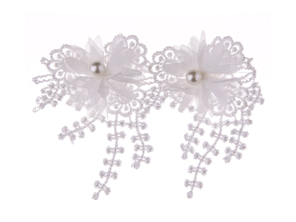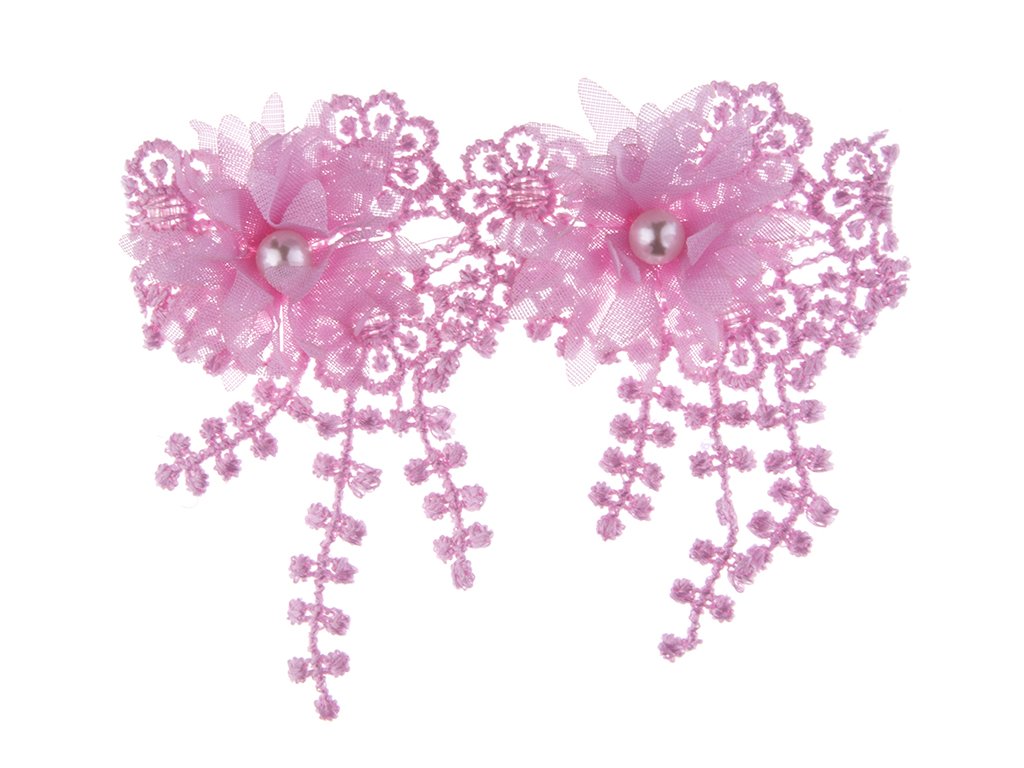 Koronkowa aplikacja tekstylna z kwiatkiem. Ozdoba nadająca się do naszywania już gotowych produktów - swetrów, bluzek, ... lub jako ozdoba._x000D_ Podana cena dotyczy długości 10 cm (2 szt. Kwiatków), przy zakupie większej ilości będzie to wielokrotność 2 szt. _x000D_ Szerokość: 7 cm