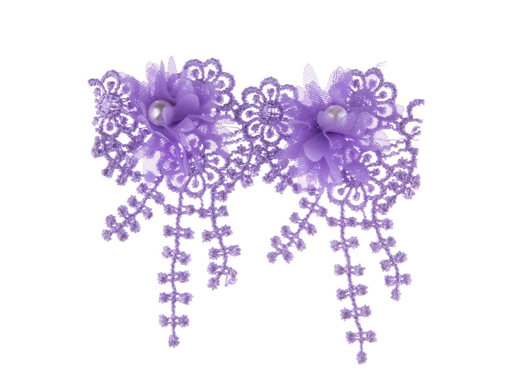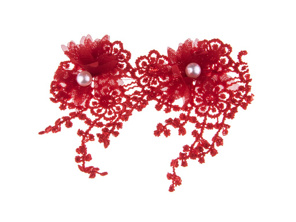 Koronkowa aplikacja tekstylna z kwiatkiem. Ozdoba nadająca się do naszywania już gotowych produktów - swetrów, bluzek, ... lub jako ozdoba. Podana cena dotyczy długości 10 cm (2 szt. Kwiatków), przy zakupie większej ilości będzie to wielokrotność 2 szt. Szerokość: 7 cm