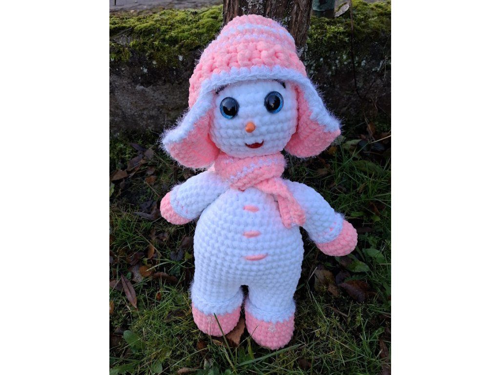 Bałwanek wykonany szydełkiem z miękkiej białej włóczki szenilowej z różowymi dodatkami.