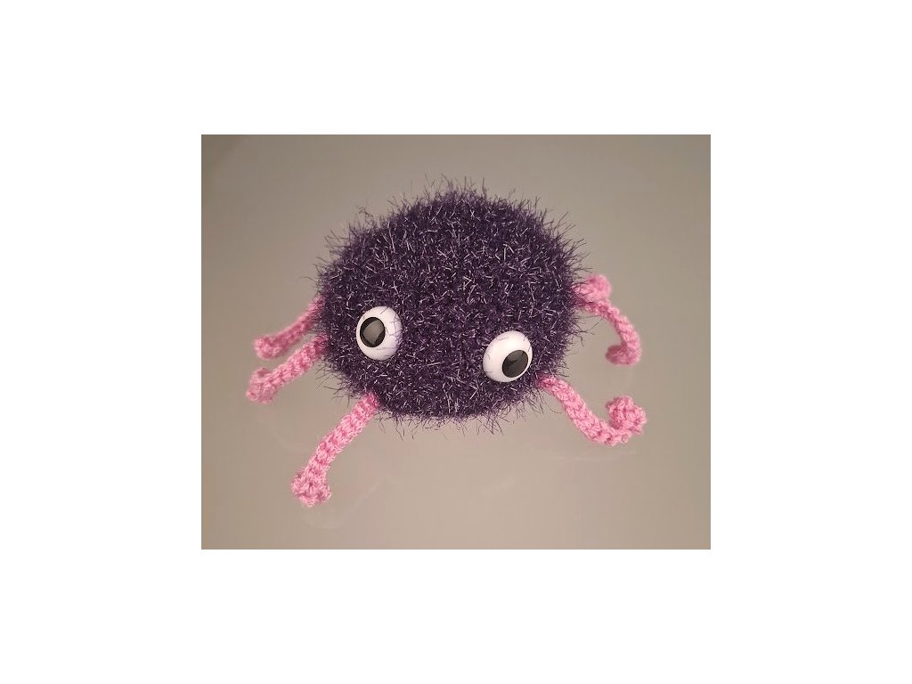 Fioletowy chrząszcz robiony na szydełku z dużymi, bezpiecznymi oczami oraz różowym brzuchem i nogami.