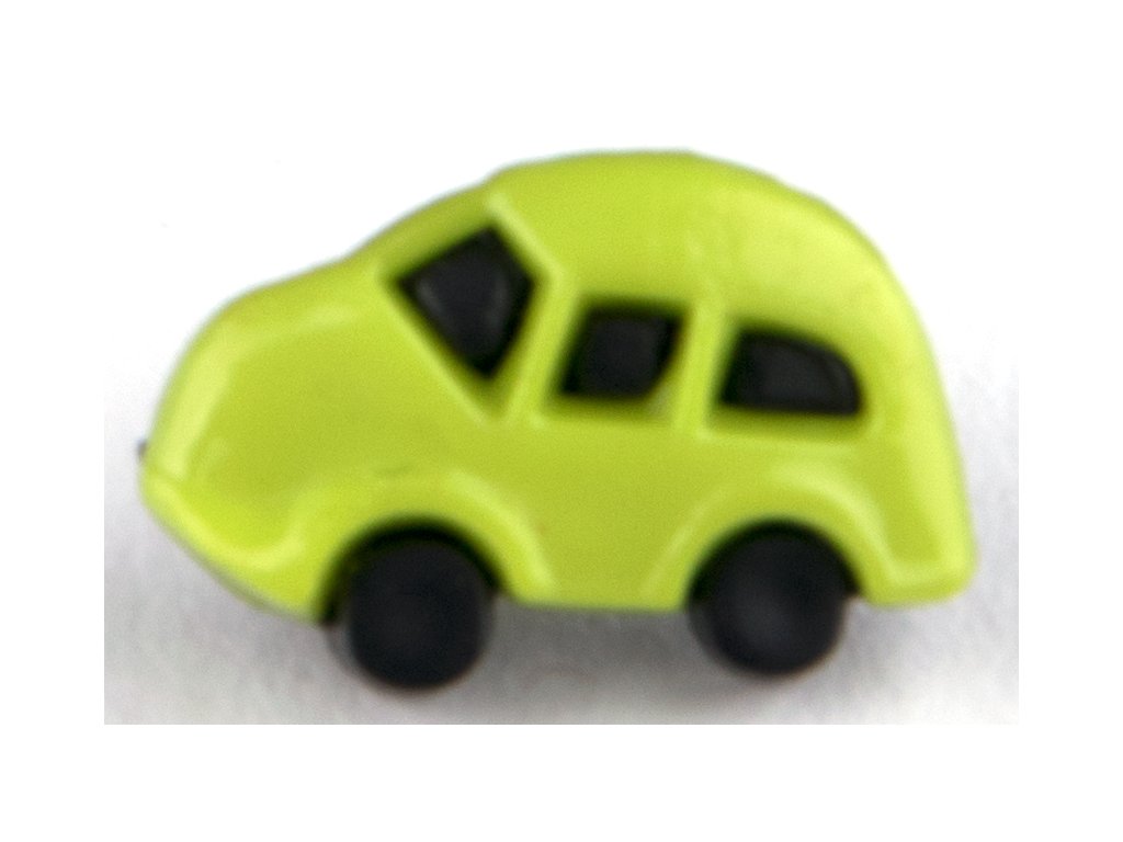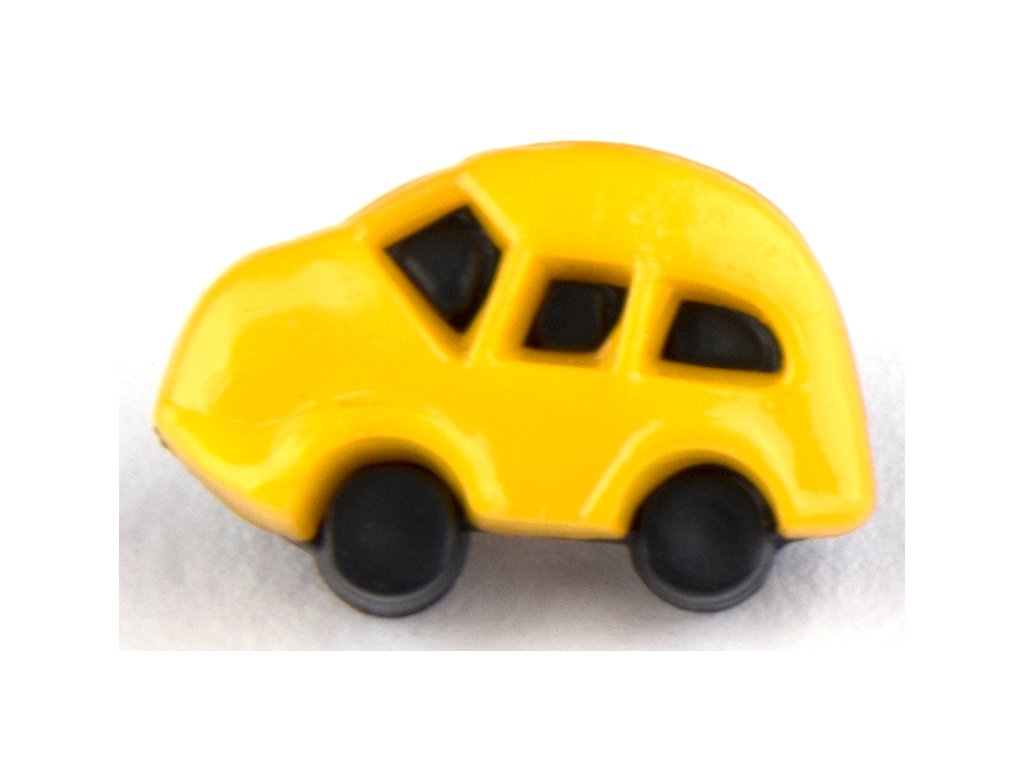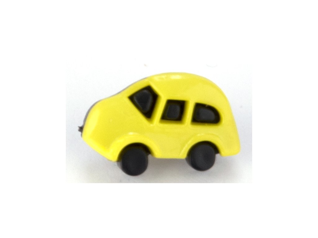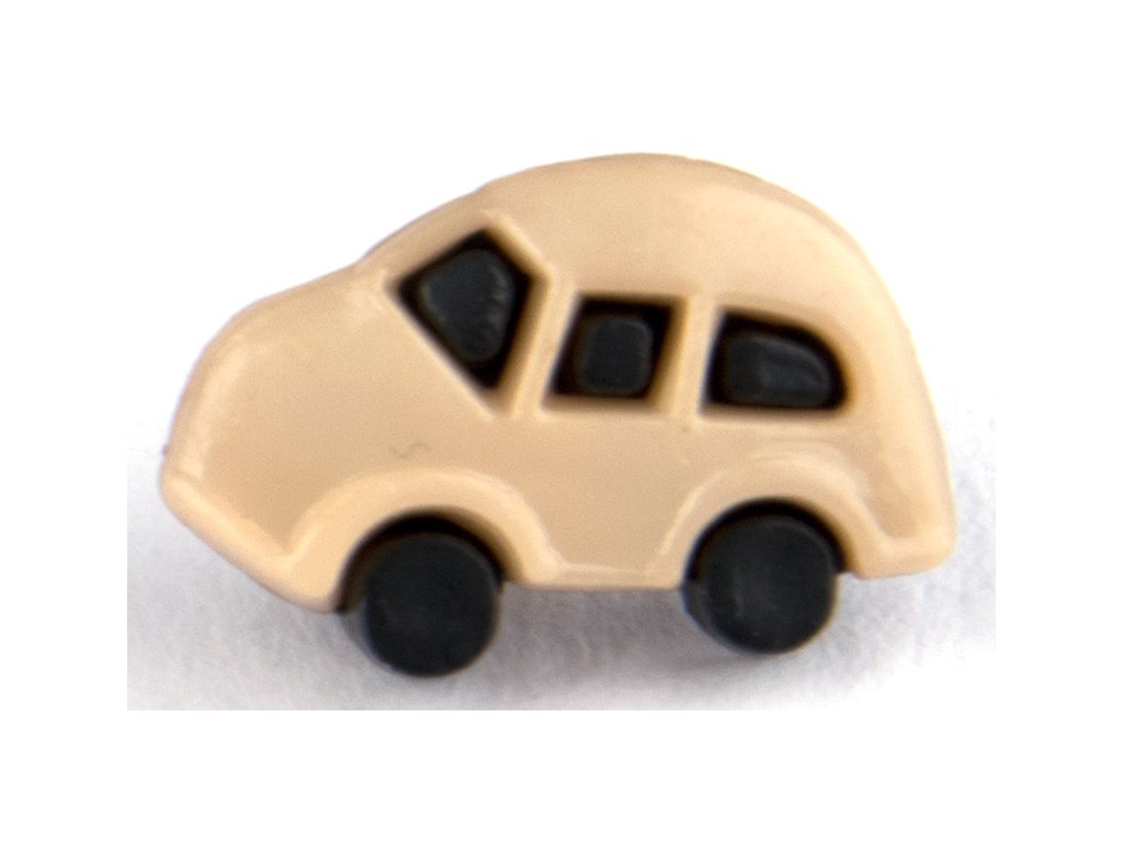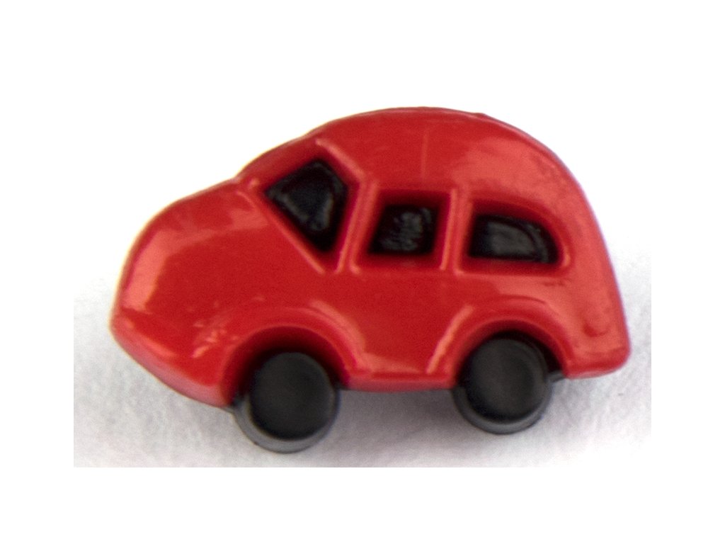 Plastikowy guzik w kształcie samochodziku, dostępny w kilku wariantach kolorystycznych.