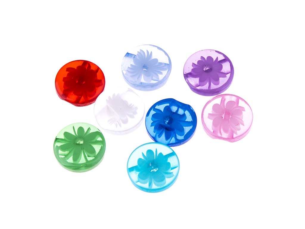 Plastikowy przezroczysty guzik z motywem kwiatowym. Nadaje się do ozdabiania ubrań, zabawek, akcesoriów domowych, ......Parametry dodatkowe