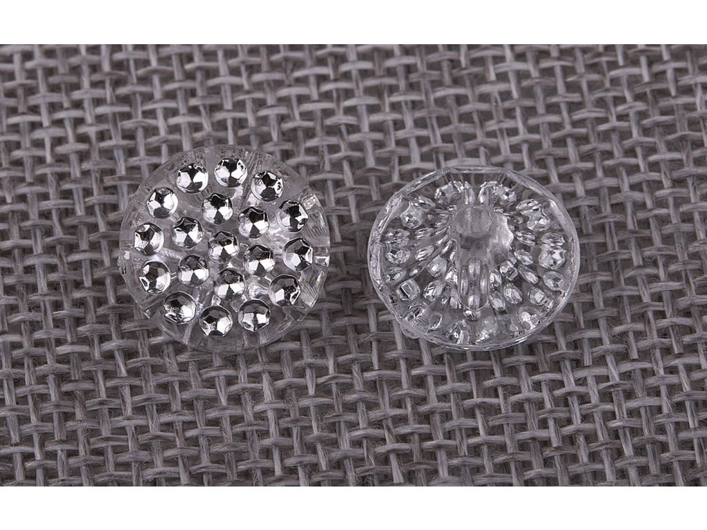 Guzik plastikowy przezroczysty o średnicy 13 mm z kryształkami, od spodu oczko do przyszycia. Nadaje się na bluzki, swetry, sukienki lub jako dekoracja. Cena za 1 sztukę.Parametry dodatkowe