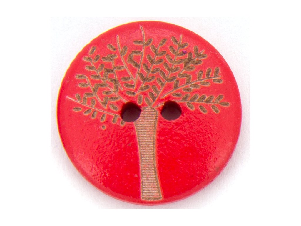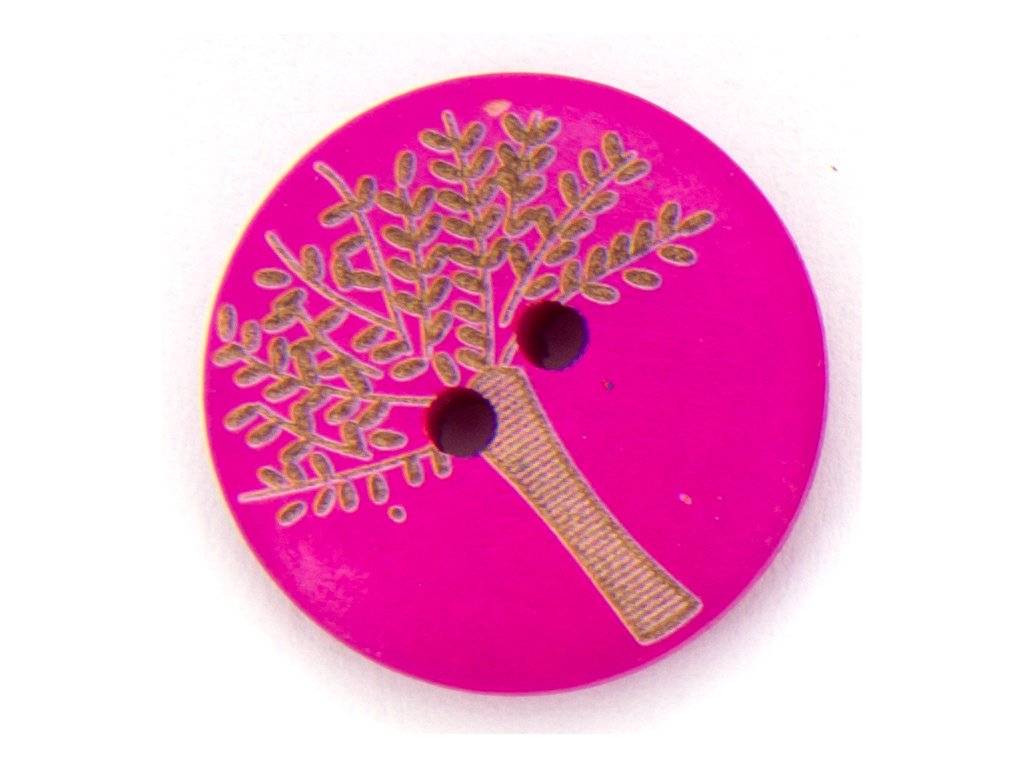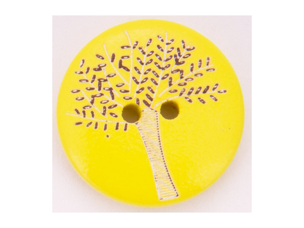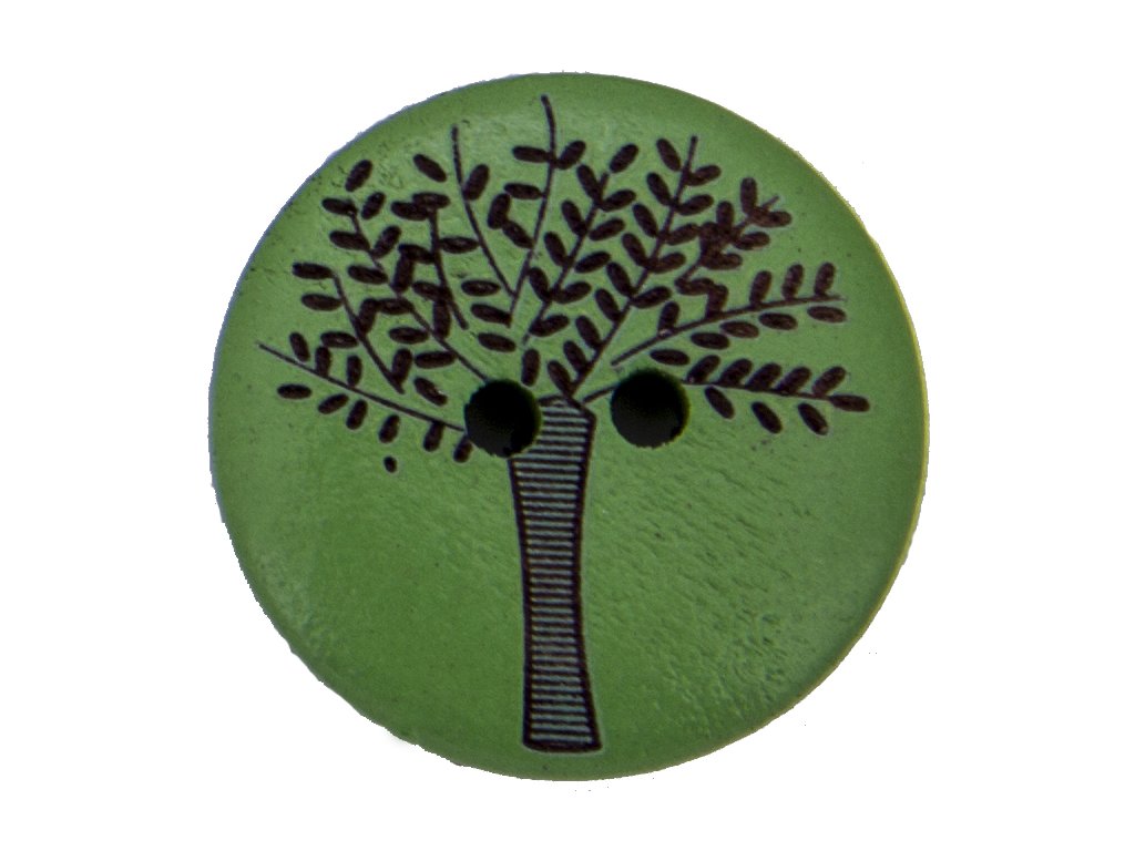 Drewniany guzik z dwoma dziurkami i wizerunkiem drzewa.Parametry dodatkowe