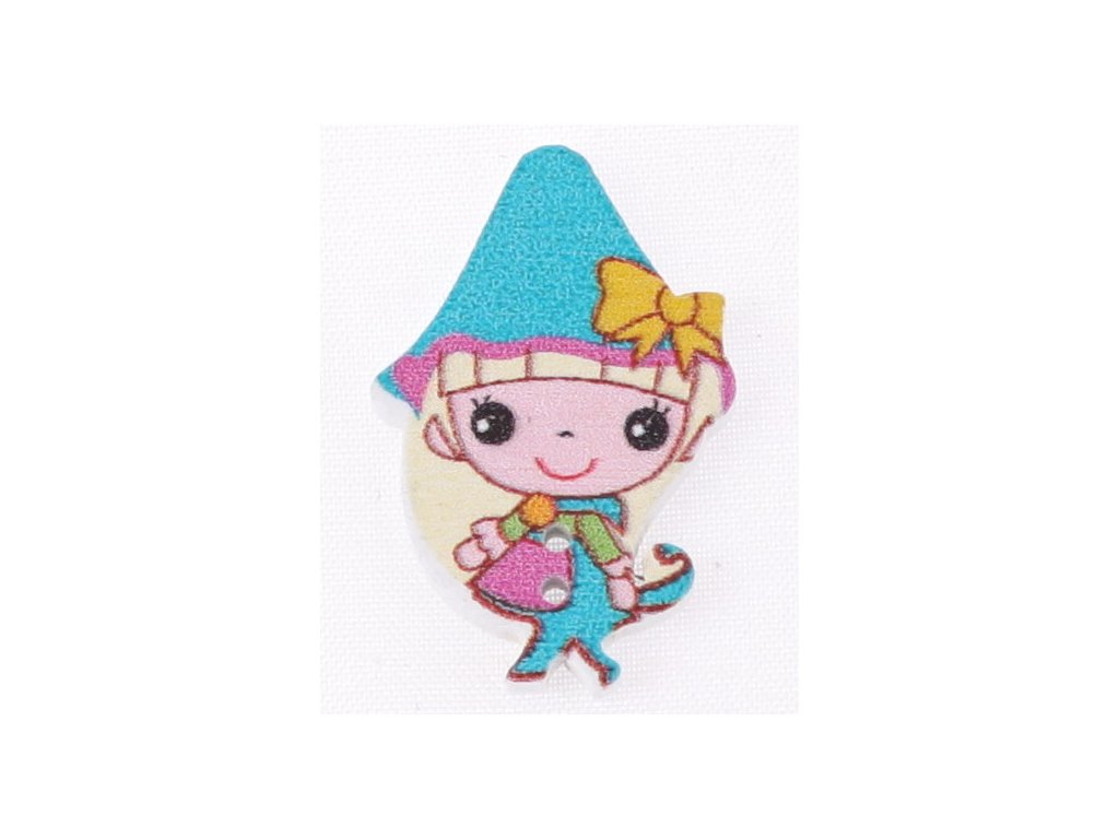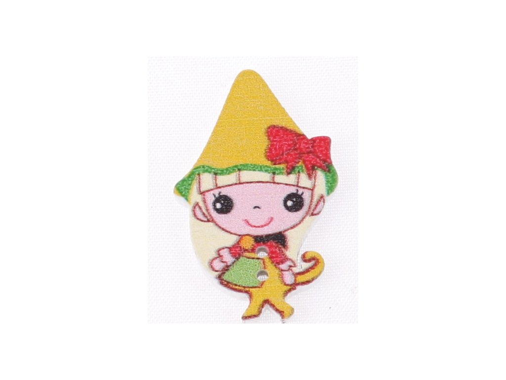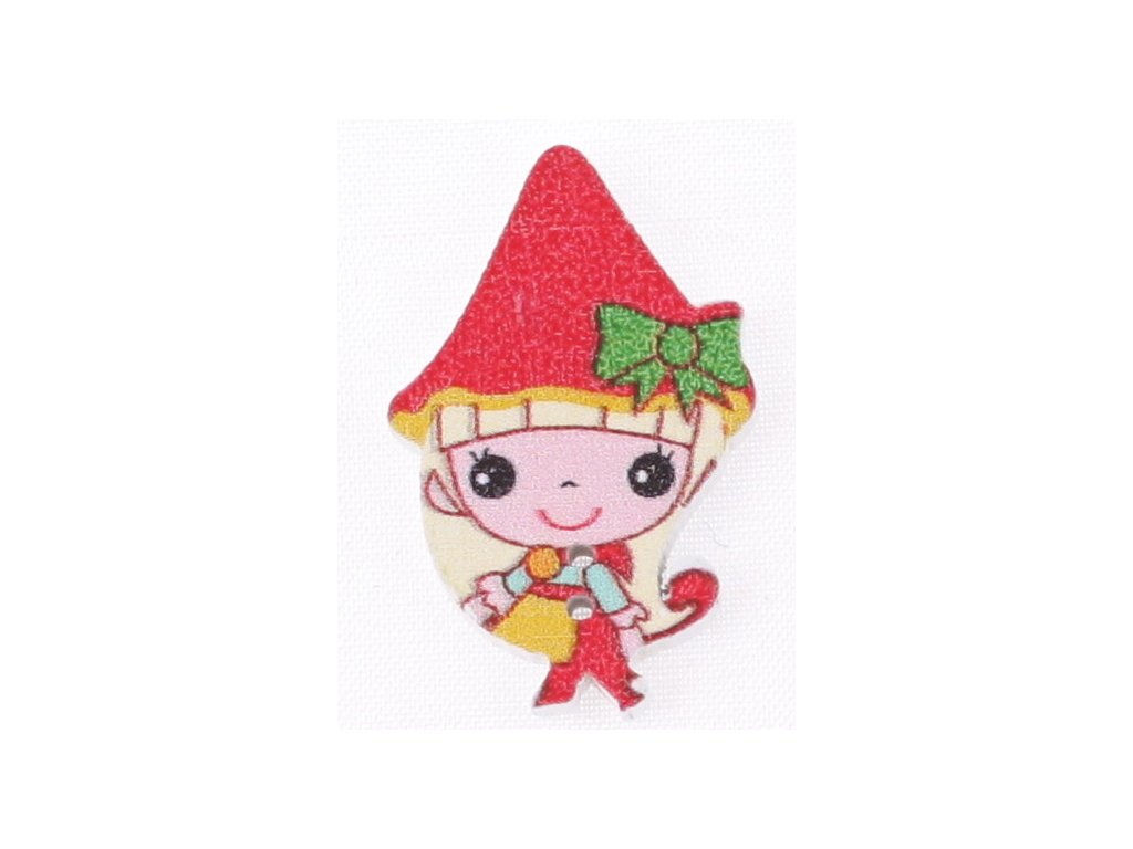 Kolorowy drewniany guzik w kształcie skrzata.
