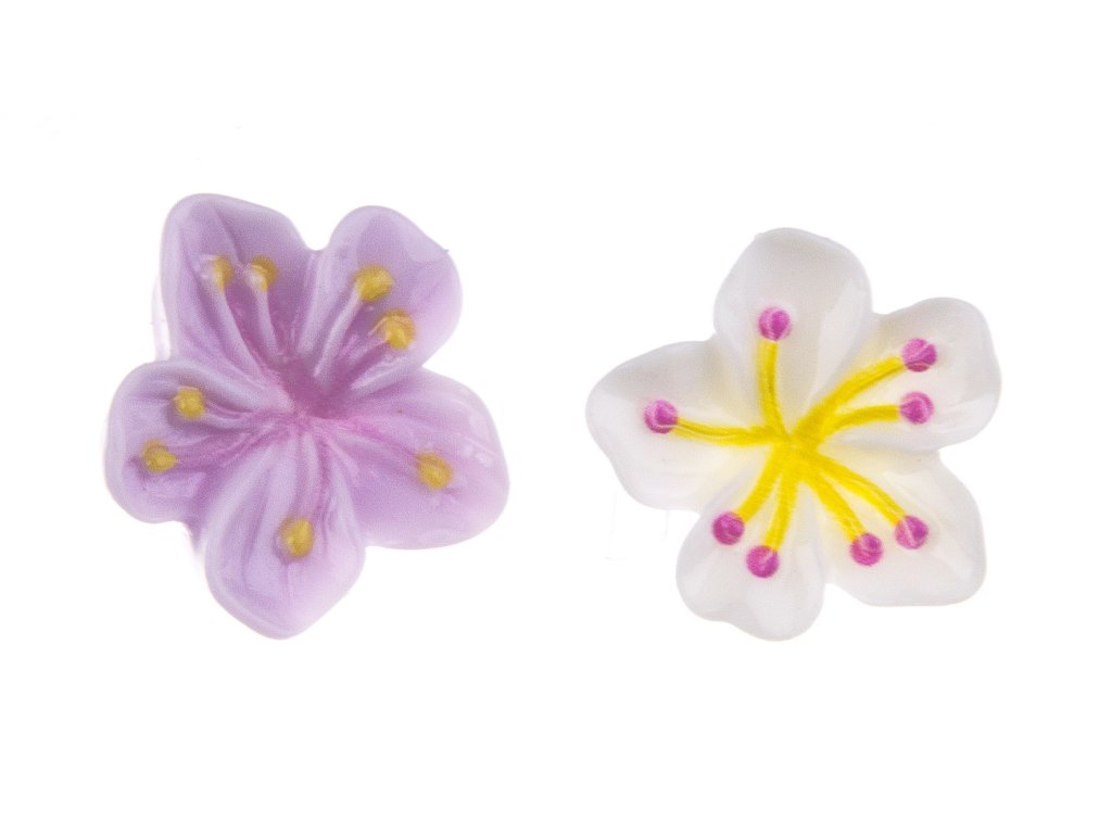 Plastikowy guzik w kształcie kwiatka z przyszytym dołem. Te ozdobne guziki nadają się jako zapięcia, ozdoba odzieży, wyrobów dziewiarskich – czapek, szalików, skarpet, kozaków, ozdób torebek, ozdób z tkanin i papieru, albumów, biżuterii – broszek, spinek do włosów, opasek na głowę.