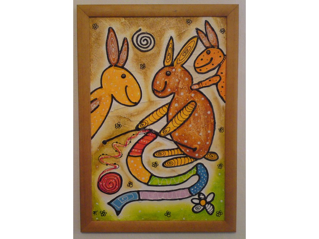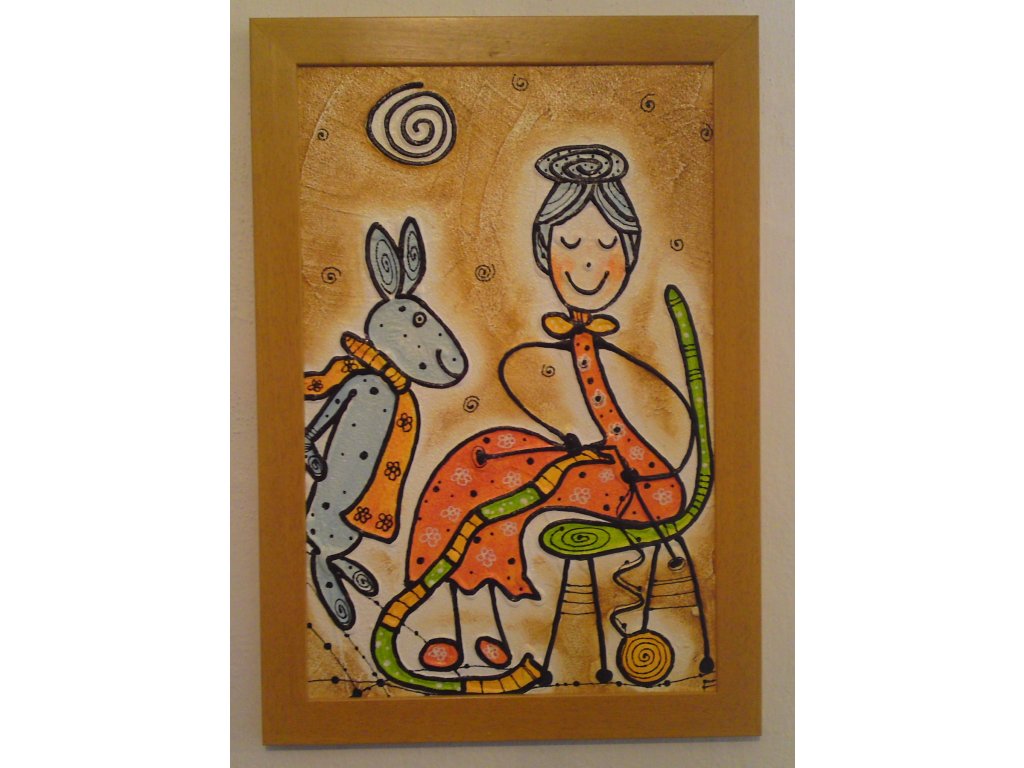Oryginalne obrazy Jany Frýblovej, malowane farbami olejnymi na betonie. Radosny motyw robienia na drutach doda przytulności każdemu miłośnikowi robótek na drutach. Wymiary: 34 x 49 cm, 44x44 cmParametry dodatkowe