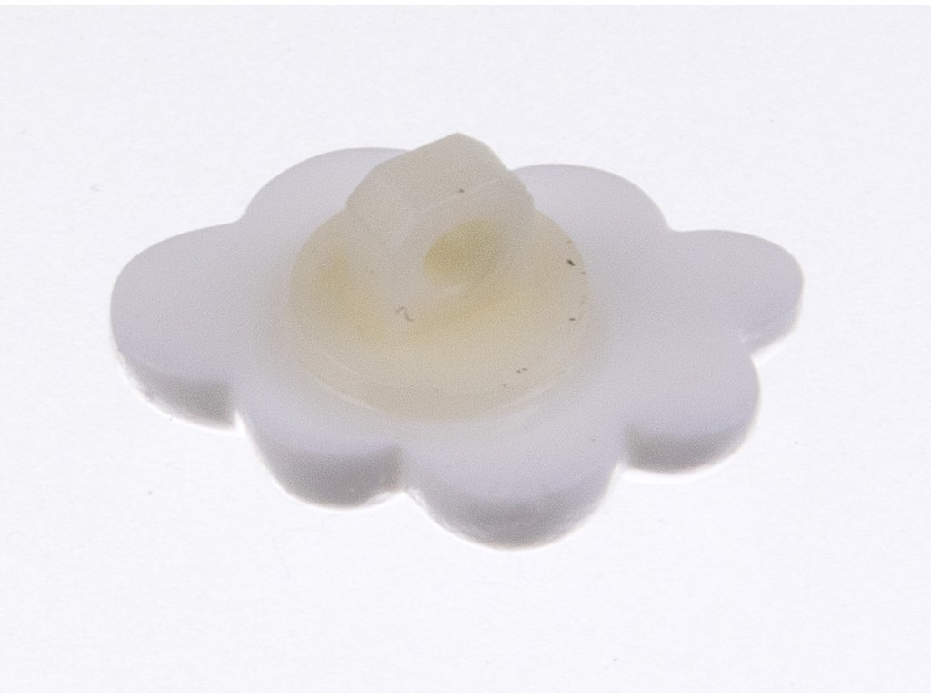 Plastikowy guzik w kształcie chmurki z przyszytym dołem. Te ozdobne guziki nadają się jako zapięcia, ozdoba odzieży, wyrobów dziewiarskich – czapek, szalików, skarpet, kozaków, ozdób torebek, ozdób z tkanin i papieru, albumów, biżuterii – broszek, spinek do włosów, opasek na głowę.