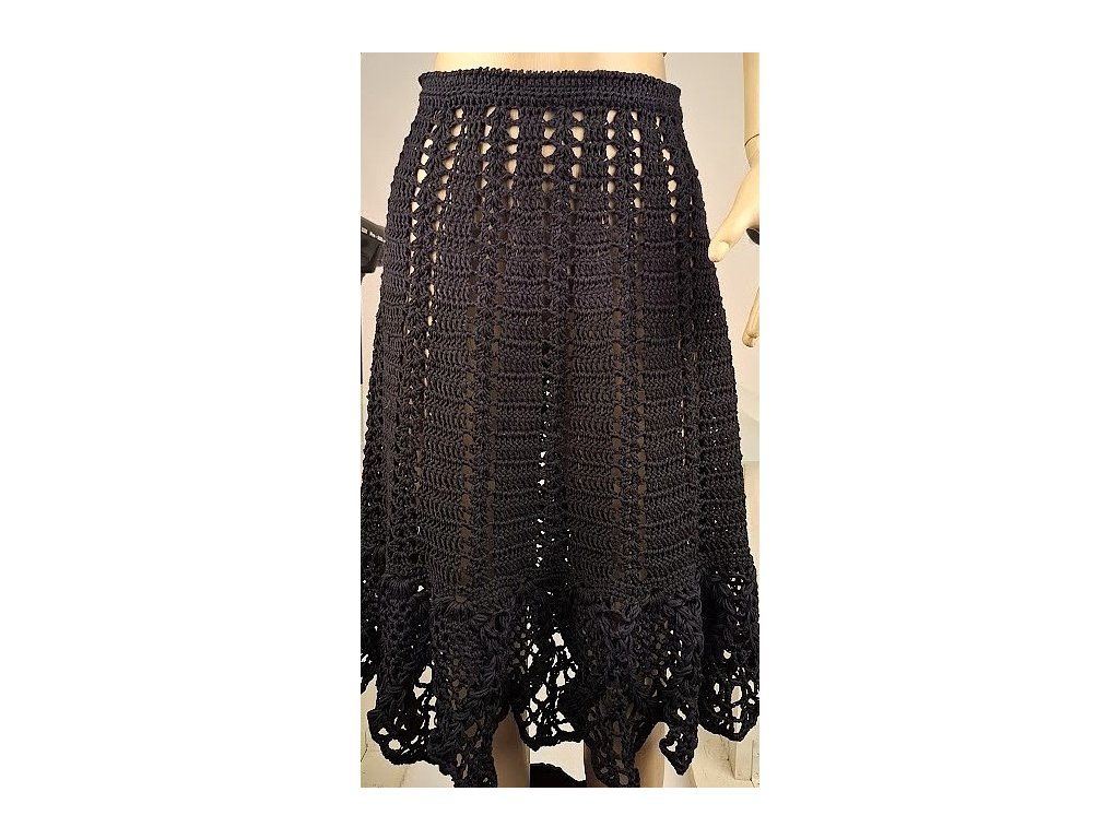 Spódnica wykonana szydełkiem z włóczki bawełnianej z niewielką domieszką poliestru, w szerokim fasonie o zwiewnym wzorze. Jest bardzo przyjemna i wygodna w noszeniu. Dolna krawędź o długości około 17 cm wykonana szydełkiem z ciekawym, koronkowym wzorem, który łagodnie przechodzi w brzegi. Spódnica zapinana jest z tyłu na 3 guziki, a w pasie ma gumkę, dzięki czemu idealnie dopasowuje się do rozmiaru.