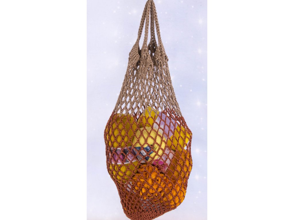 Szydełkowa torba z bardzo elastycznej, błyszczącej włóczki. Z mocnymi uchwytami. Bardzo wytrzymała.