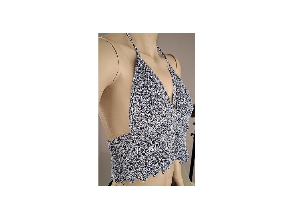 Bawełniany top szydełkowy w kolorze niebiesko-białym. Koronki z tyłu i na karku, gdzie można regulować rozmiar. Obwód wykonany szydełkiem z kwadratów.