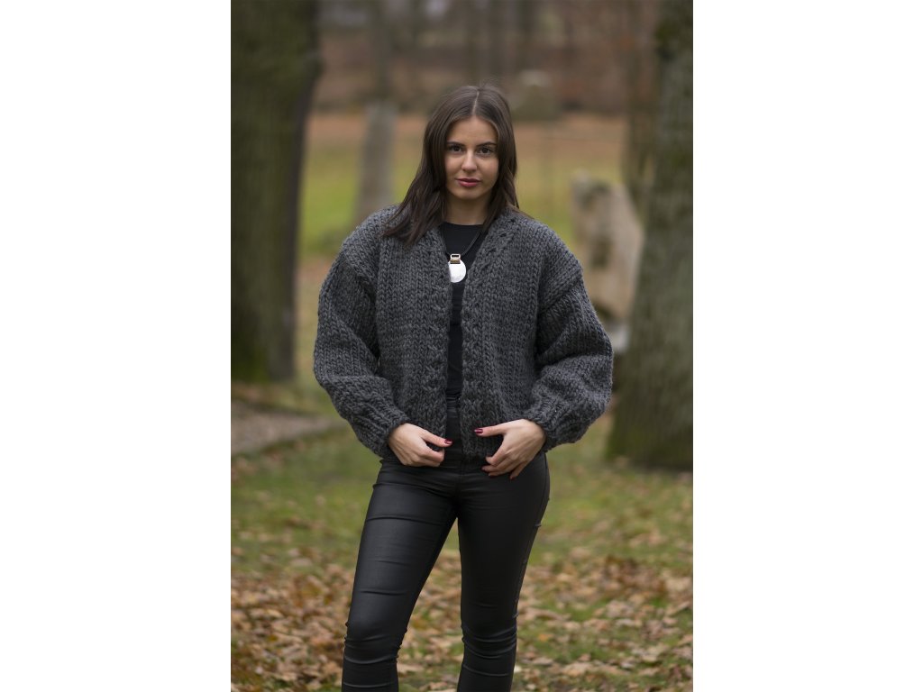 Tmavě šedý silný svetr do pasu, s volnými rukávy a se zapínáním na dekorativní klipsny.