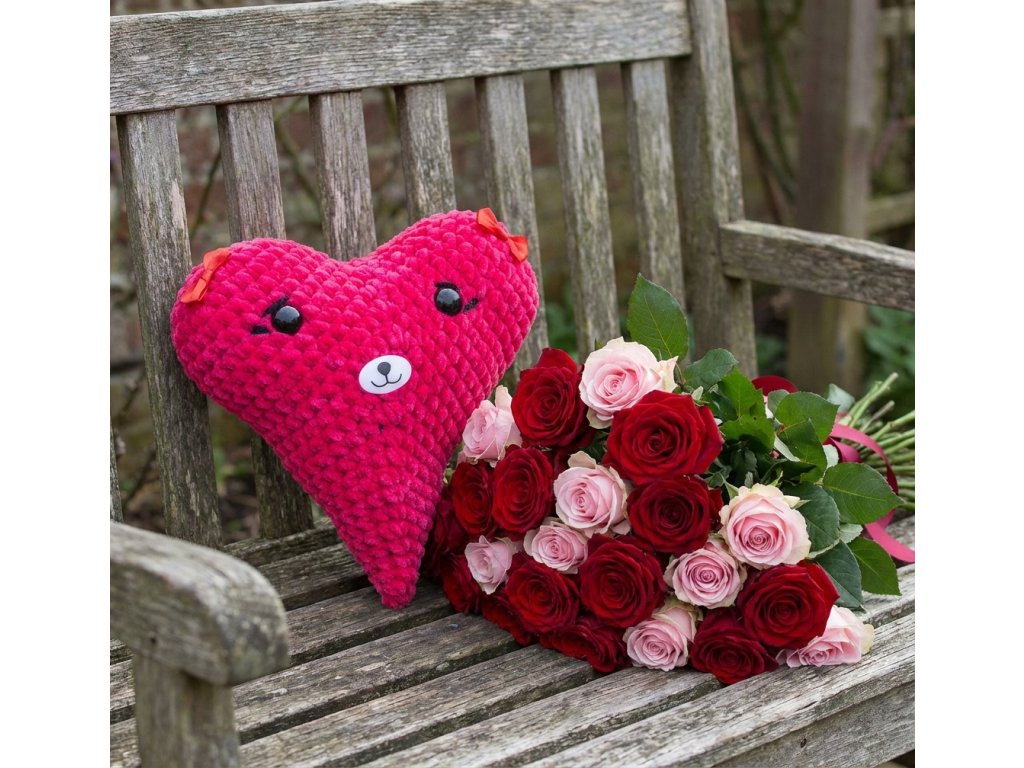 Měkký polštářek ve tvaru srdce s černýma očima a mašličkami. Ideální dekorace pokojíčku pro slečny nebo jako dárek k Valentýnu.