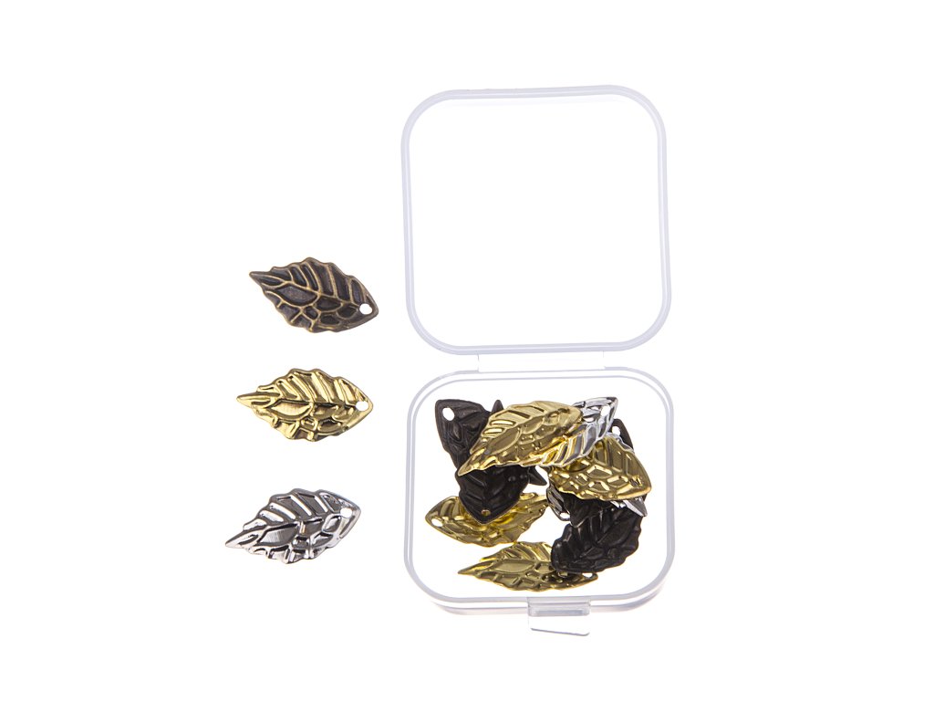 Kovový lístek v mixu barev. Baleno v praktické plastové krabičce po 15 kusech. Je vhodný k výrobě různých šperků, jako přívěšek na náhrdelník nebo k připnutí na klíče.Doplňkové parametry