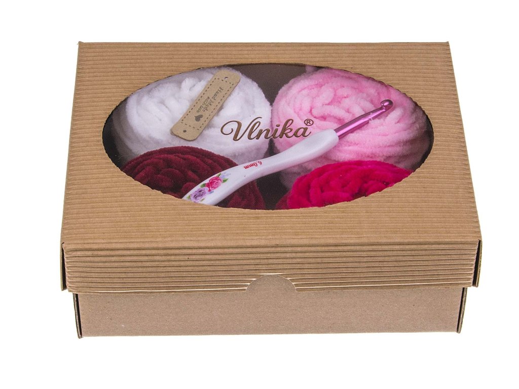 Krabička s ozdobným logom VLNIKA obsahuje 4 rôznofarebné klbká 100% polyesterovej priadze, 14cm kovový háčik číslo 6 s ergonomickou rukoväťou a ceduľku Hand Made z umelej kože. Hmotnosť všetkých klbiek dohromady je cca 130 g.