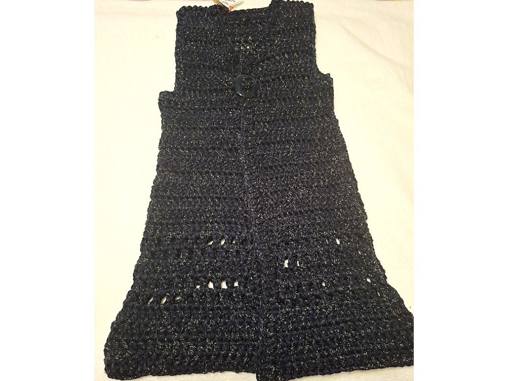 Vesta je háčkovaná zo silnej tmavo modrej priadze so zlatým lurexovým vláknom. Je dlhá 105 cm a zapínanie má na ozdobnú sponu.