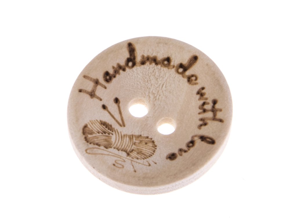 Na gombíku je nápis Hand made with love a obrázok klbka. Tieto dekoračné gombíky sú vhodné ako zapínacie gombíky, ozdoba na oblečenie, pletené veci - čiapky, šály, ponožky, podkolienky, dekorácie na taštičky, látkové aj papierové dekoračné predmety, scrapbook, šperky, ...Dodatočné parametre