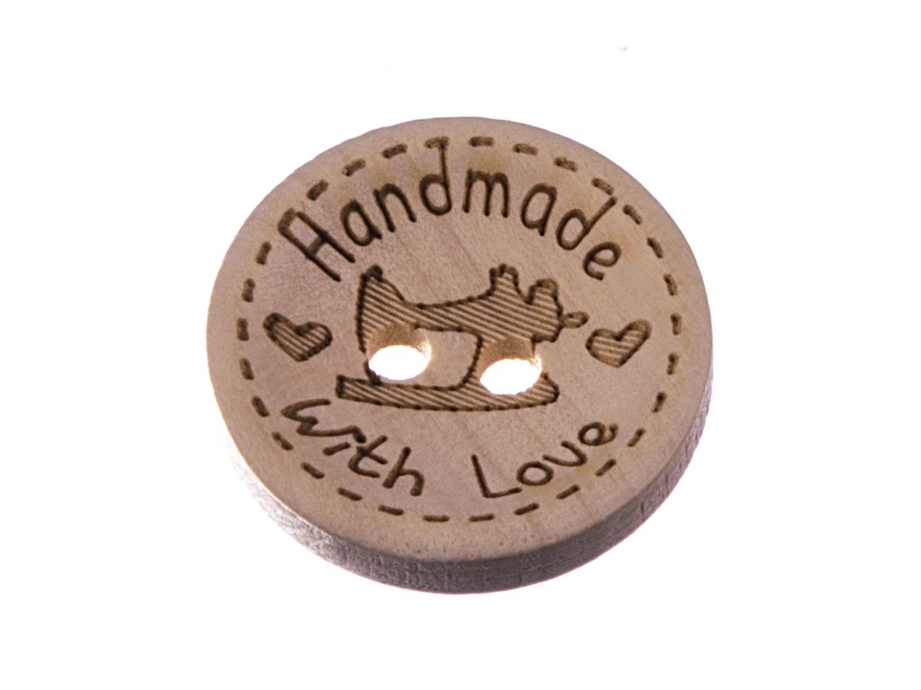 Drevený gombík o veľkosti 20 mm s nápisom Hand Made. Tento dekoračný ozdobný gombík je vhodný ako ozdoba na oblečenie, háčkované a pletené veci - čiapky, šály, ponožky, podkolienky a ako dekorácia na taštičky, kabelky.Dodatočné parametre