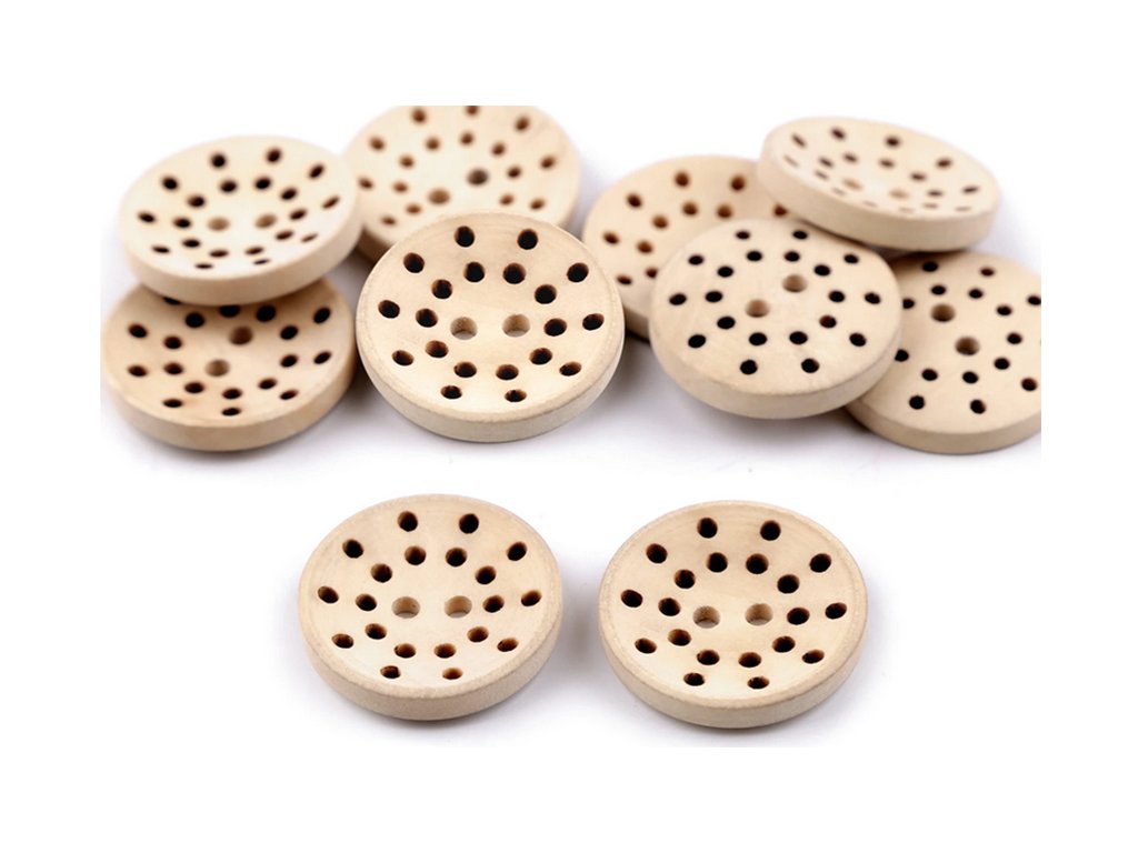 Drevený gombík o veľkosti 25mm, vďaka efektnému dierovaniu môžete ozdobiť výšivkou alebo inou dekoráciou._x000D_ Tieto dekoračné gombíky sú vhodné ako zapínacie gombíky, ozdoba na oblečenie, pletené veci - čiapky, šály, ponožky, podkolenky, dekorácie na taštičky, látkové aj papierové dekoračné predmety, scrapbook, šperky,...