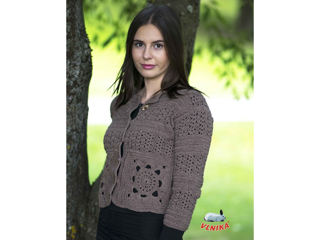 Háčkovaný svetrík s trojštvrťovými rukávmi pre teplejšie obdobie. Vyrobený z jemnej priadze s kombinovanými vzormi.